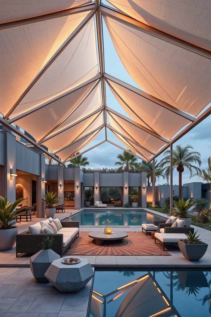 These canopies typically feature angular frames, triangular tension fabrics, or polygonal metal structures. Beneath them, I prefer minimalist furniture such as modular seating, concrete side tables, and streamlined lounge chairs. This balance ensures that the canopy remains the dominant visual feature without competing elements.