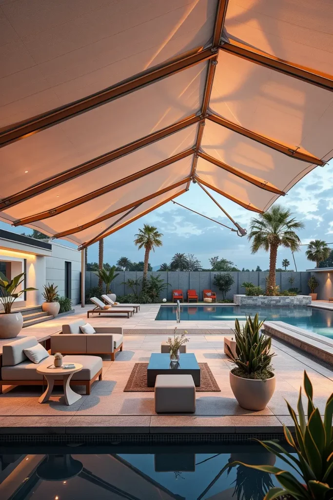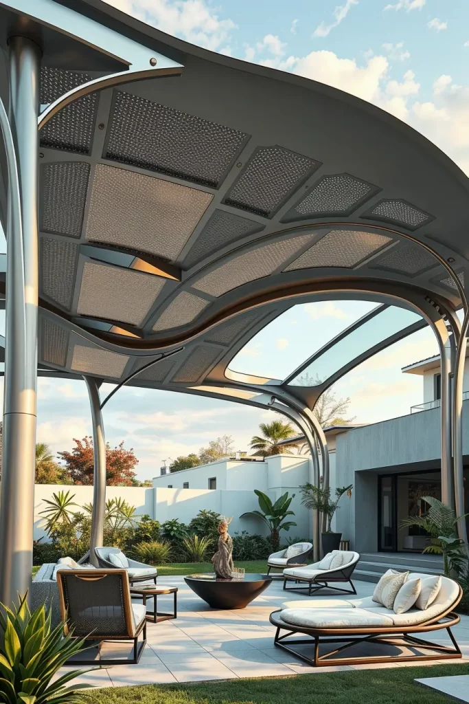 In my professional experience, futuristic canopy structures work particularly well near modern homes with large glass facades or geometric architecture. Architectural Digest frequently highlights how sculptural outdoor structures can serve as both functional shade and artistic focal points. I find that these canopy forms often become the defining feature of the entire outdoor environment.