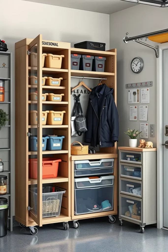 I prefer to add tall cabinets or vertical shelf units which can have labeled bins—one for seasonal activities or family-centered activities. Think of stackable totes with transparent sides for effortless viewing or drawer pulls labeled by occasion. A rod for hanging coats not in season, and hooks for seasonally rotated accessories also work great.