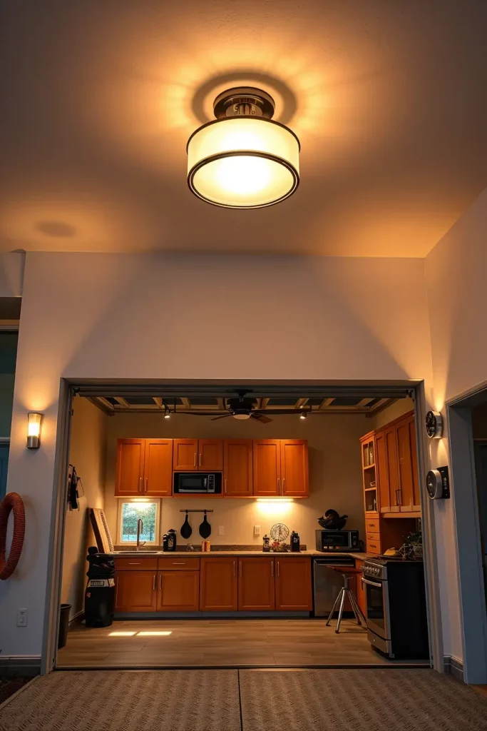 Add a flush-mounted or recessed ceiling light to the garage or waning lights for general illumination. For mood and focused lighting, consider adding wall sconces and under-cabinet lamps. To foster a warm and inviting atmosphere, always use LED bulbs. In case your garage entry is part of a smart home system then motion activated flood lights or lights with timers can be really helpful.