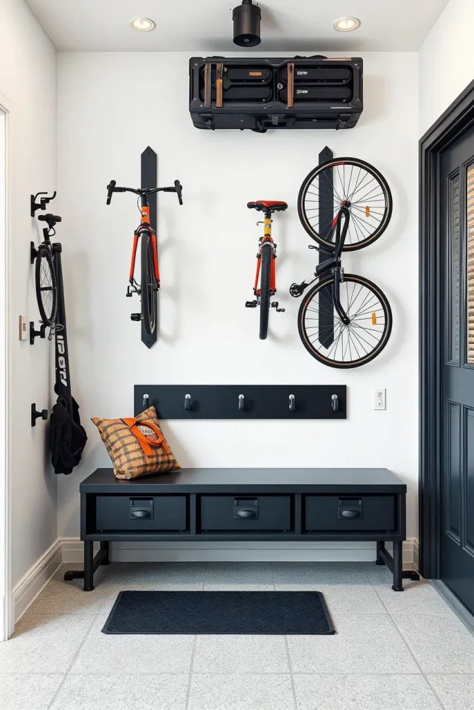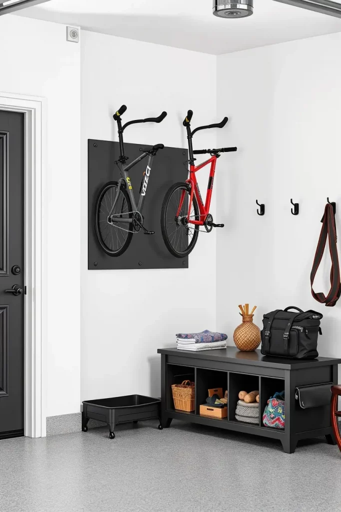 Given my preference, wall-mounted hooks with rubber grips or arms that can pivot out, as well as pulley systems that let one easily lift the bike without straining, provide the most ergonomical solutions. All of this works perfectly in combination with a bench underneath the hooks and a cubby to store helmets and gloves. Finishes like painted plywood or metal backplates for walls also improve style and strength.