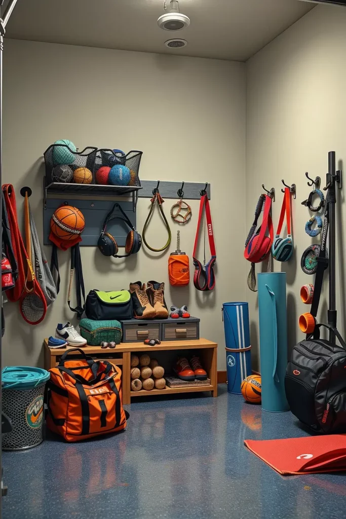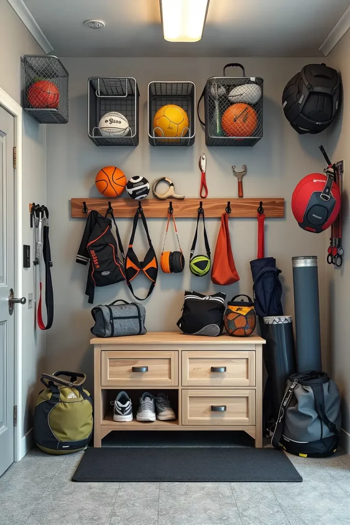 For constructing the organizational area, use tall mesh bins for balls, S-hooks for hanging gear bags, and wall racks for hockey sticks, baseball bats, or yoga mats. Above the bench, put hooks and use a sturdy bench with drawers underneath to store shin guards and smaller items while sitting and lacing up.