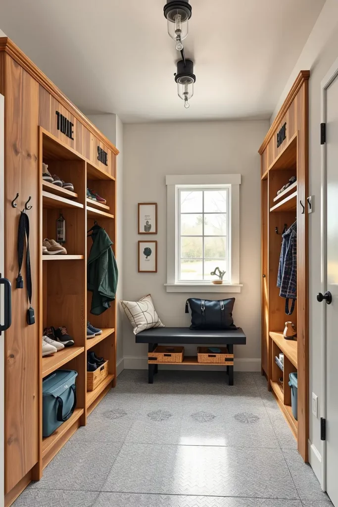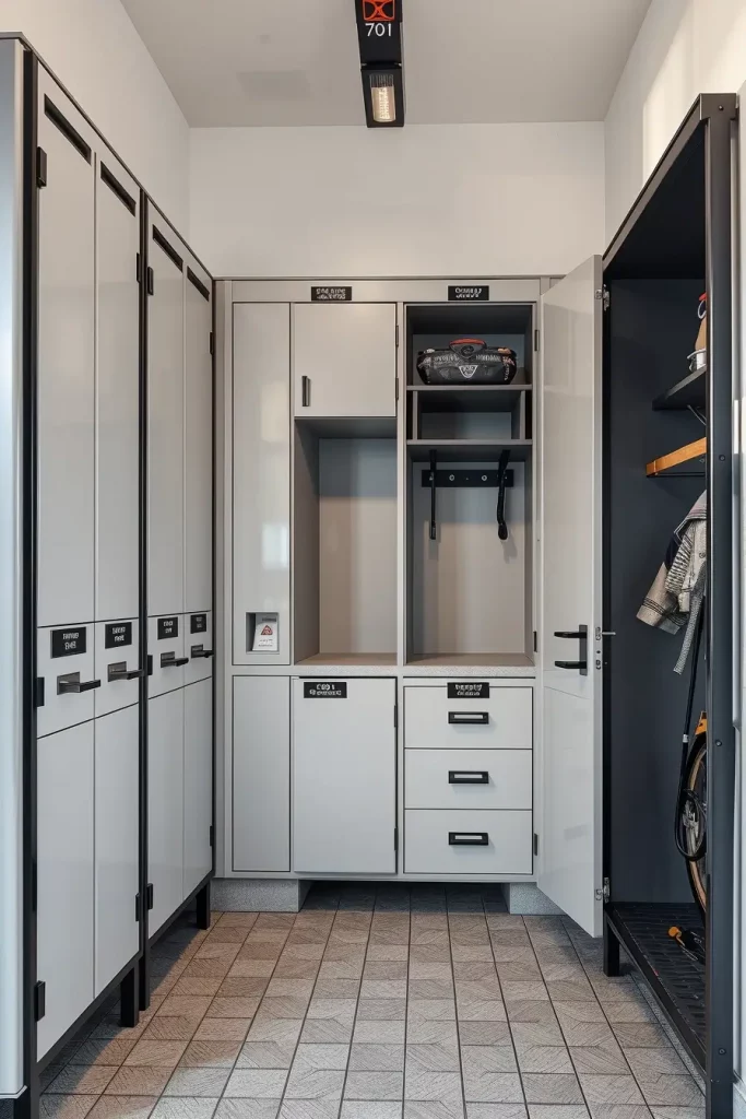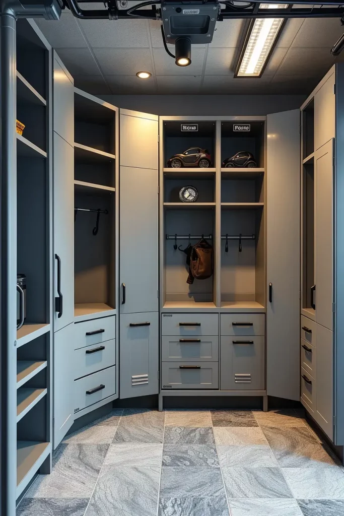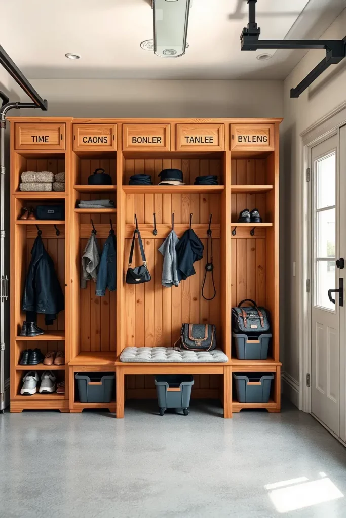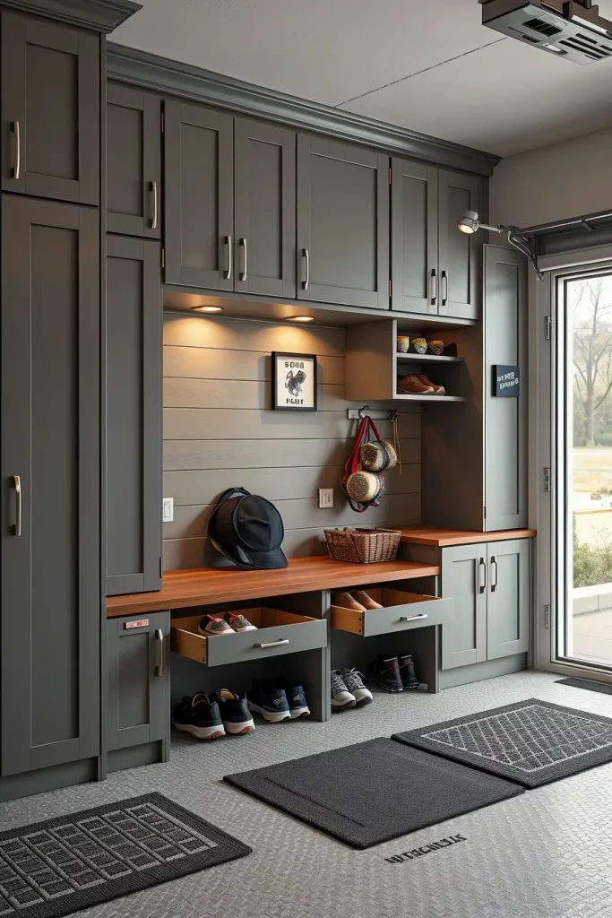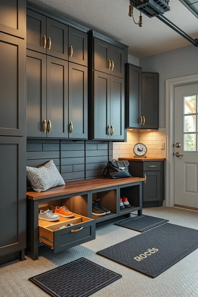 From my perspective, one of the most useful enhancements to a garage entryway is creating personalized storage cubbies for each family member. My preferred spot is just inside the door that leads from the garage to the house because it allows them easy access to store their shoes, jackets, and other gear. This configuration not only improves organization, but also makes the space warm and welcoming. In my opinion, cubbies crafted from melamine or MDF in soft neutrals or matte black for modern elegance should be used.