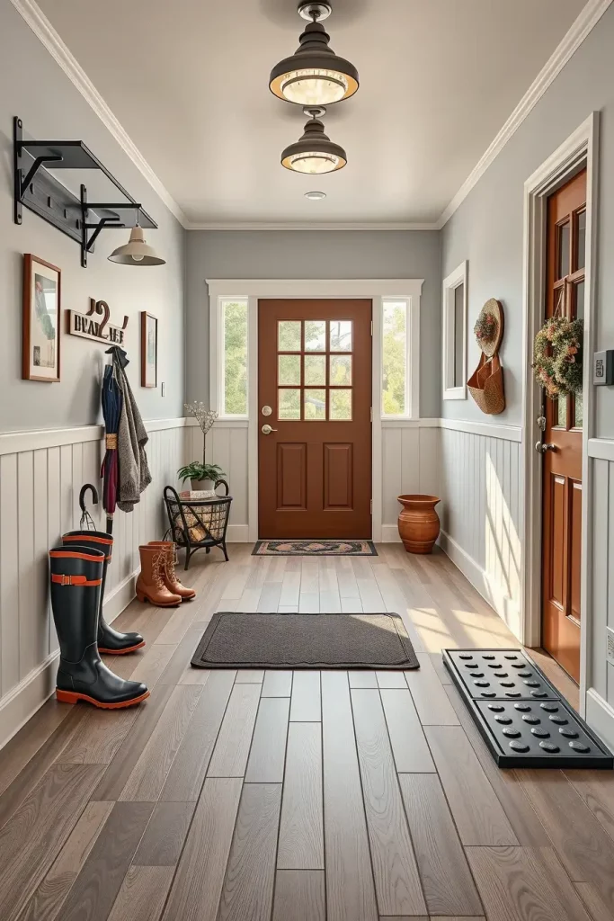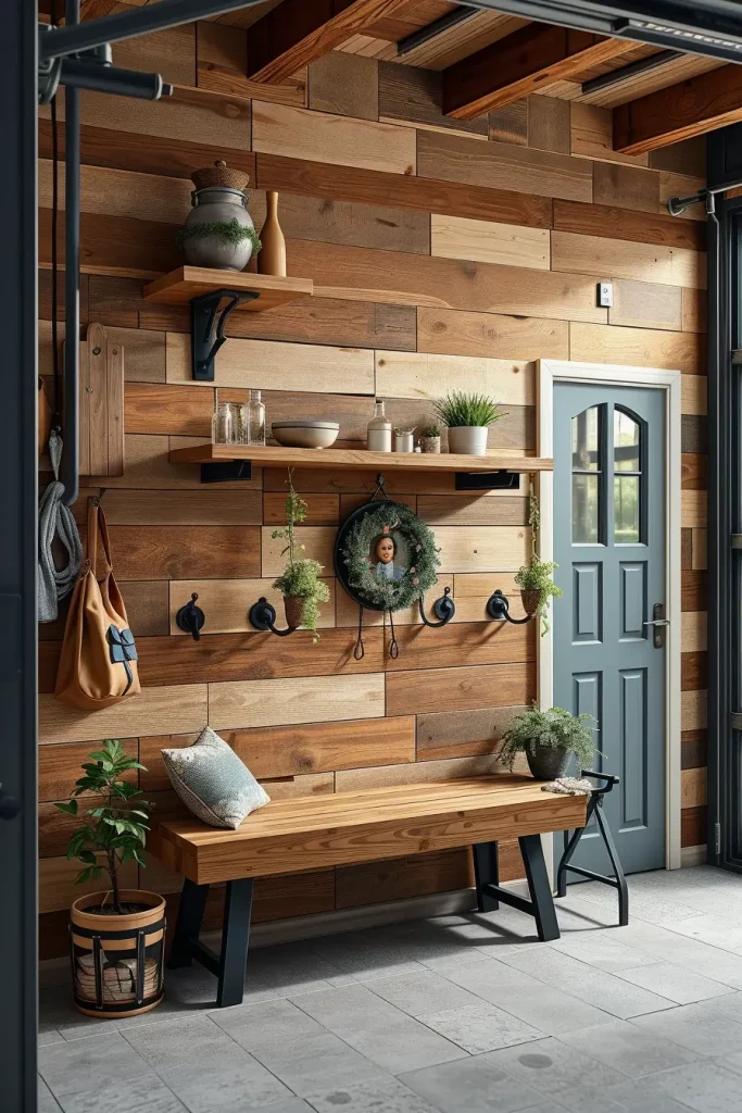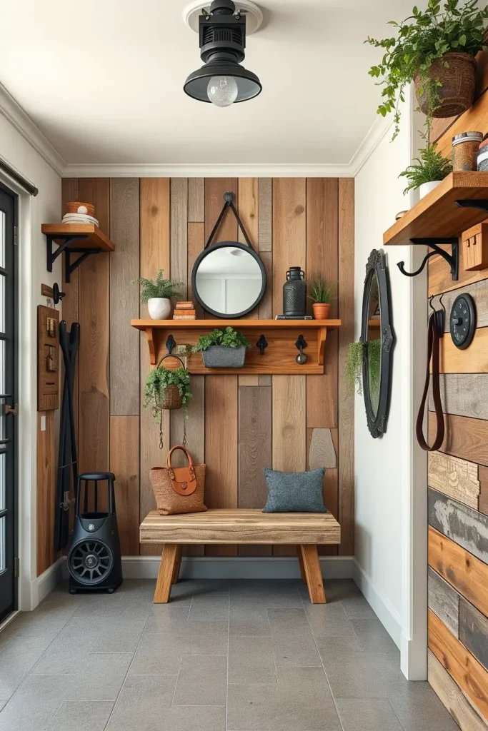 For the enclosed space, I prefer adding floating wooden shelves, a reclaimed wood console table, and a wood paneled wall section with coat hooks. Black metal hardware beautifully contrasts with the wooden tones and industrial lighting. With such features, you can accent the space with vintage mirrors or wooden sign names.
