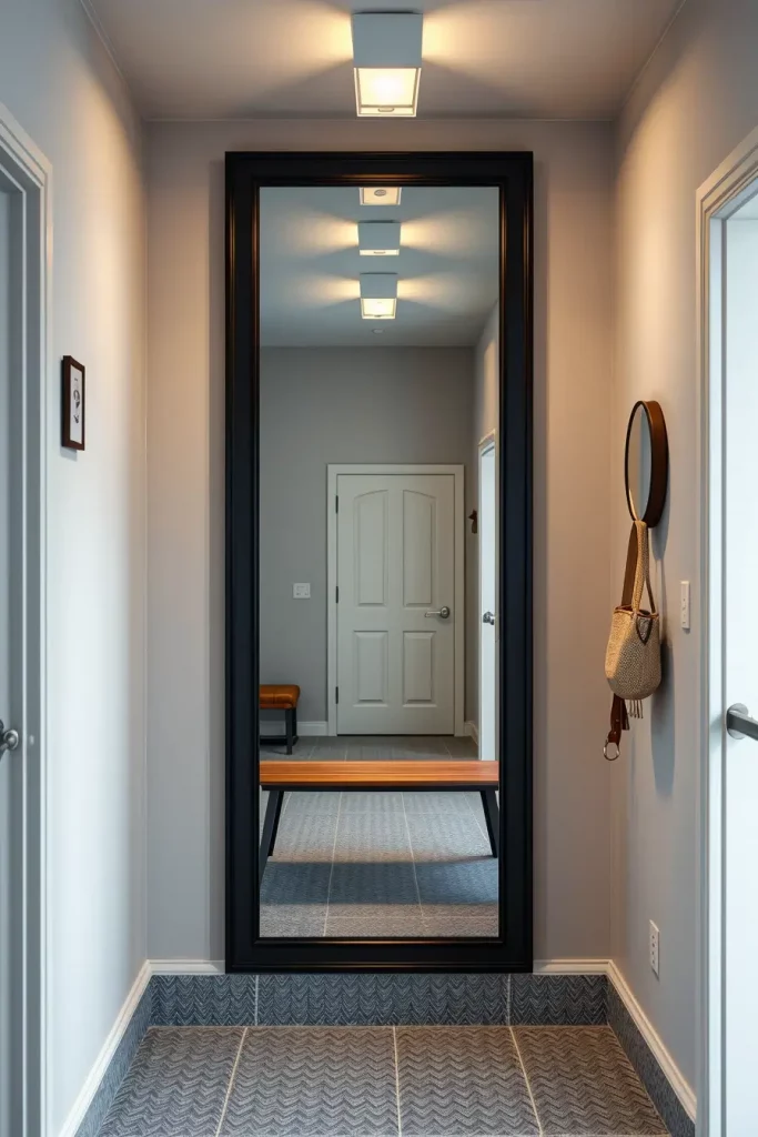 I usually place mirrors on walls where they can serve two purrposes, enhancing the width of rooms looking more attractive at the same tome. This gives mirros additional functions and achieves the main goal of beautifying the entry. I go for slim framed full length mirrors that match the entryway decor. In modern designs, mirrors complimented with wall sconces that provide light over them work beautifully. They can also be placed at benches and doors to increase light bouncing as well as sophisticate the room.