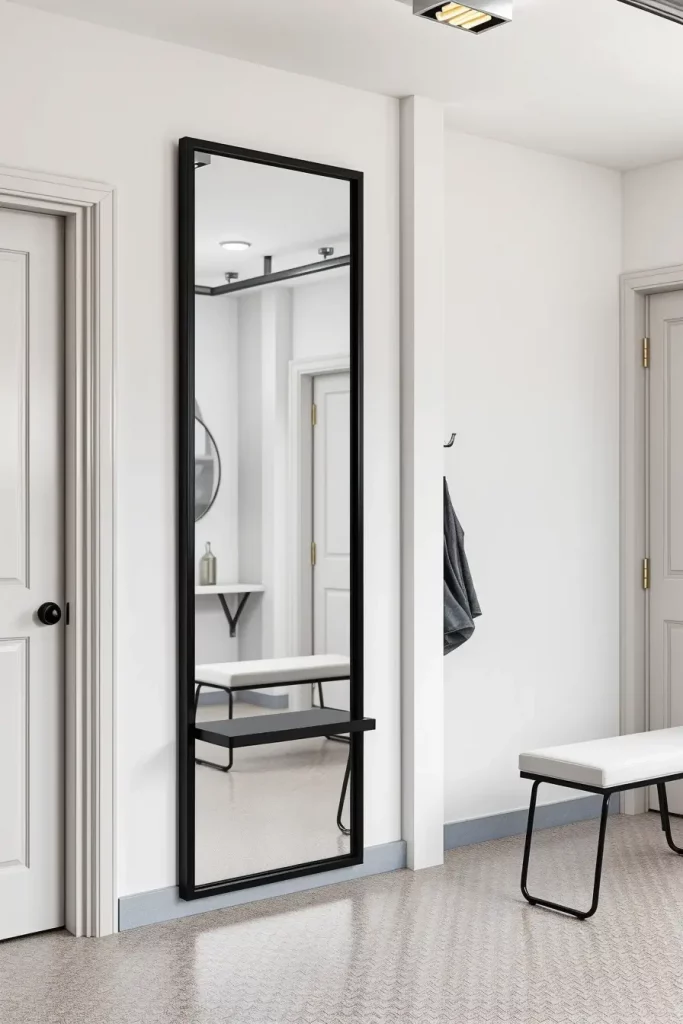 As House Beautiful noted, mirrors have further functions than decorations – they serve as effective tools for clever design trick in tighter spaces. In my own home, I achieved this functionality by hanging a tall mirror beside the door with a slimb shelf underneath it. This provides a space for sunglasses and mail and helps make last minute outfit checks easier.