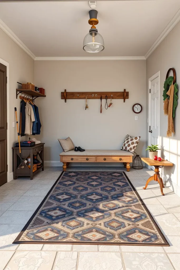 In my setup, I use an outdoor rubber-backed woven rug that can withstand muddy boots and is easily hosed off. Outdoor-grade rugs work smarter indoors, as stated Martha Stewart Living, especially in high traffic areas such as garage entries.
