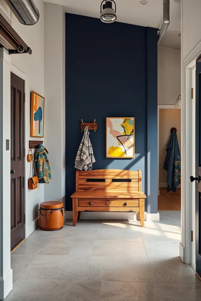 I generally recommend using one wall situationally for a bench, console table or even coat hooks as a focal point. In these areas, mat finish sclae work best because they diffuse sharp light and minimize scuffs. Additionally, I recommend high-quality scrubbable paint as this area is prone to grime and smudges. Moreover, the paint can be framed with wall decoration, shelves, or even stenciled design for more appeal.