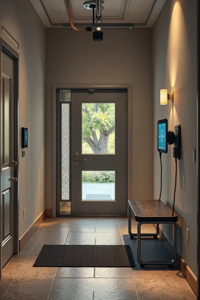 Smart lights with motion sensors, smart thermostats positioned close to the entrance, as well as smart locks with keypad or app access are features that I usually add. I’ve additionally mounted tablets on the walls that show family calendars, weather forecasts, and can even serve as an intercom. These upgrades in technology can be done without them standing out—there are now stylish sleek trim options that harmonize with modern decor.