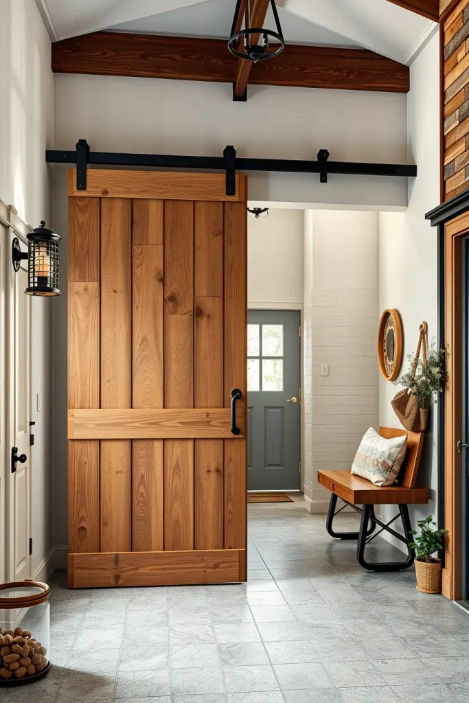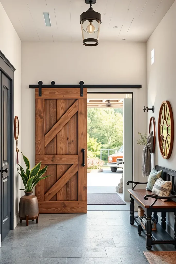 In cases where a garage opens directly into a hallway or even a kitchen, I have found sliding barn doors to serve both style and functionality. These doors don’t need space to function, serve as a visual partition, and add a rustic feeling to functional spaces which is a bonus.