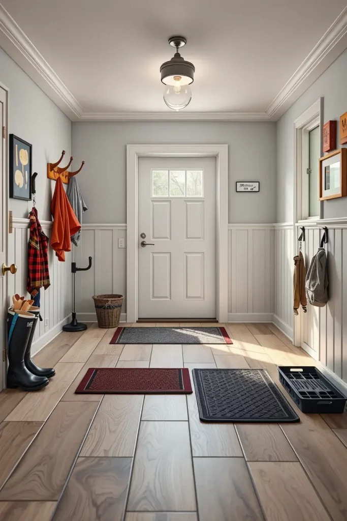 Flooring is critical Here and everywhere else. I usually recommend porcelein tiles with a matte finish or vinyl plank flooring that emulates wood, but can handle wet boots and mud. Also, I suggest placing an overhanging small porch outside the garage door entry or even vestibule level with an outdoor mat to help trap moisture before it enters your home. Moreover, remember to add weather stripping for the interior garage door to save energy and prevent drafts.