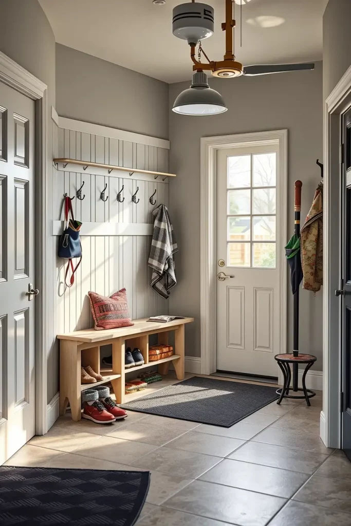 In my opinion enhancing this area, built-in cubbies or shallow baskets situated beneath the bench where young children can store their backpacks, sports equipment, or other belongings would make this even more practical. Keeping everything off the floor and within easy reach is always a goal.