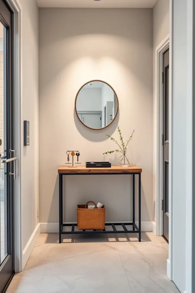 You could also consider adding wall-mounted coat hooks above the console, provided they do not reduce floor space, to maximize the room’s usefulness.