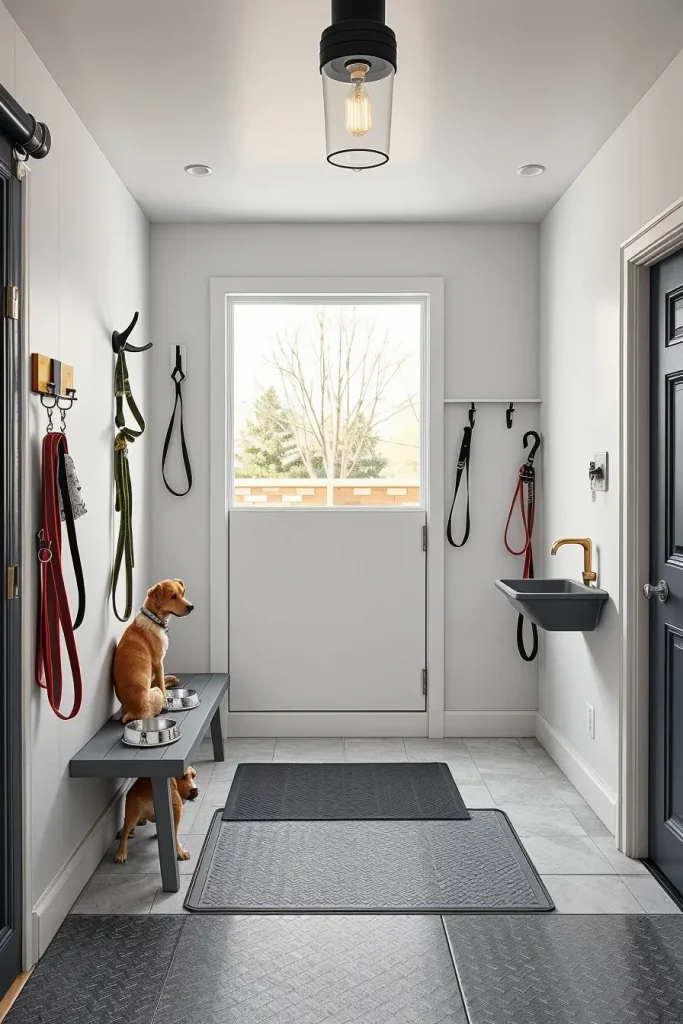 An ideal pet station should have a shelf that accommodates a cabinet, wall hooks for the leashes, and a rug or mat placed at the entrance to trap dirt. I’ve also incorporated a small washing area for dogs into some garage entries, especially in areas with heavy rainfall or snow. This design helps keep the rest of the house tidy while giving the pets their own space.