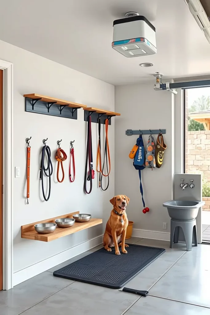 Integrating a pet station at the garage entry is useful for families with pets. Having worked with many homeowners, I always recommend that there should be a space for pet hygiene just before entering the house. This should ideally be equipped with a storage compartment for leashes, hooks for collars, and a bench containing drawers for grooming tools and even treats.
