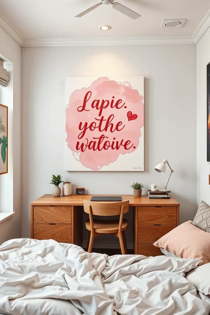 I have done once a set of three canvases called Dream. Create. Repeat.” and it was actually the highlight of my room. Real Simple recommends grouping quotes in odd numbers (like sets of 3 or 5) for visual harmony, which really enhanced my layout.