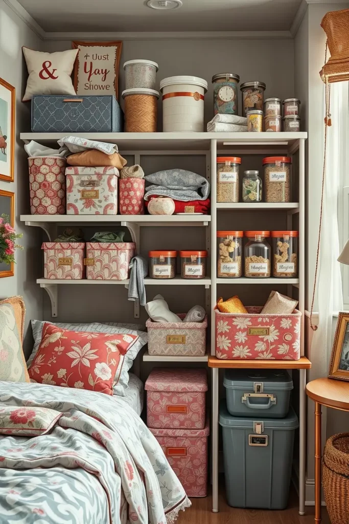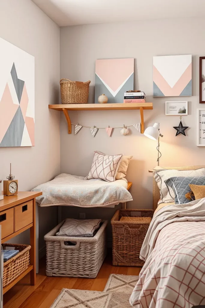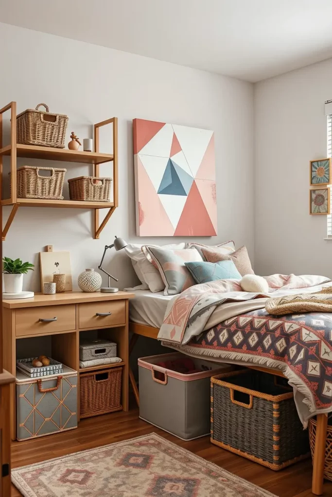 Storage is a needed thing in the dorm life, yet it can be not so dull. I always recommend painted baskets you can make as chic decoration and clever storage. They may be stored under beds, on shelves, as well as in closets, and they will be still fabulous.