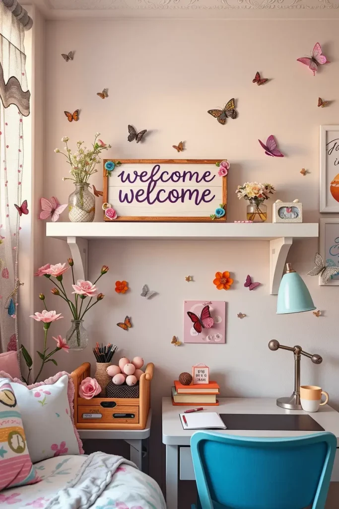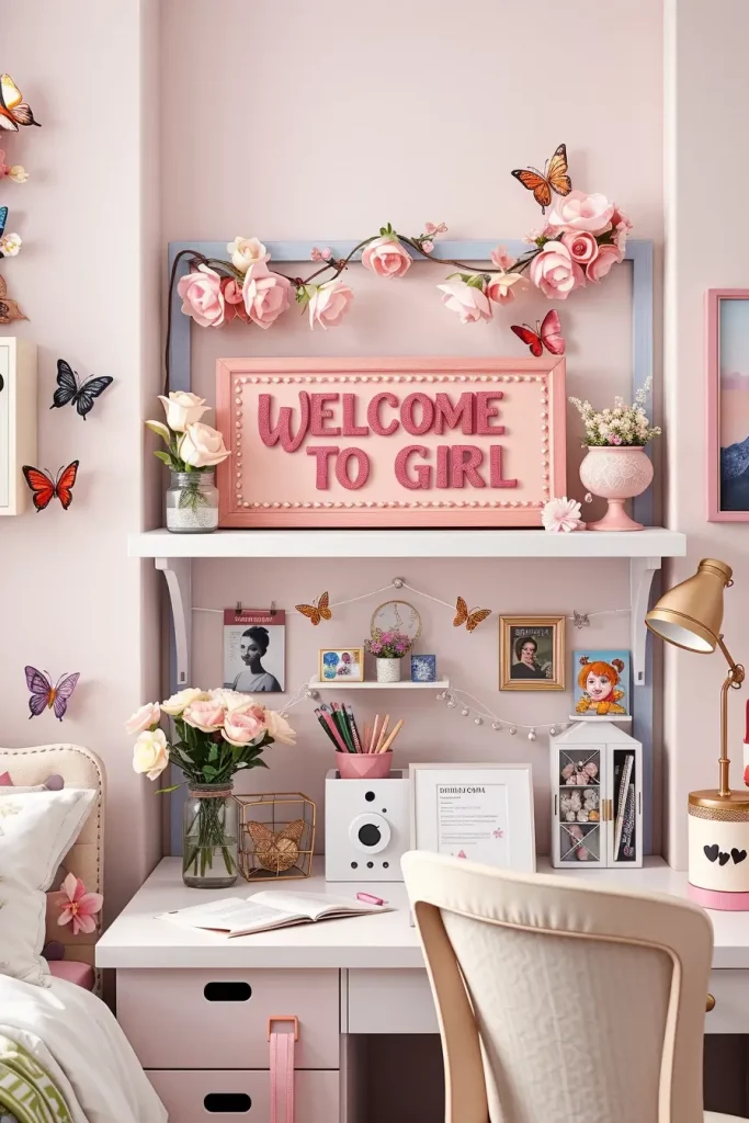 I created it in the form of a wooden plaque I found at the craft store, it has been painted in pastel pink and lavender with hand letters such as Welcome to Elle Space. I added glittered accents, fake flowers, and smaller three-dimensional butterflies as dimensional tools. To create a similar effect, you may also take foam board, cardstock or layered scrapbook paper. Pin it up with an easel, or against a bulletin board.
