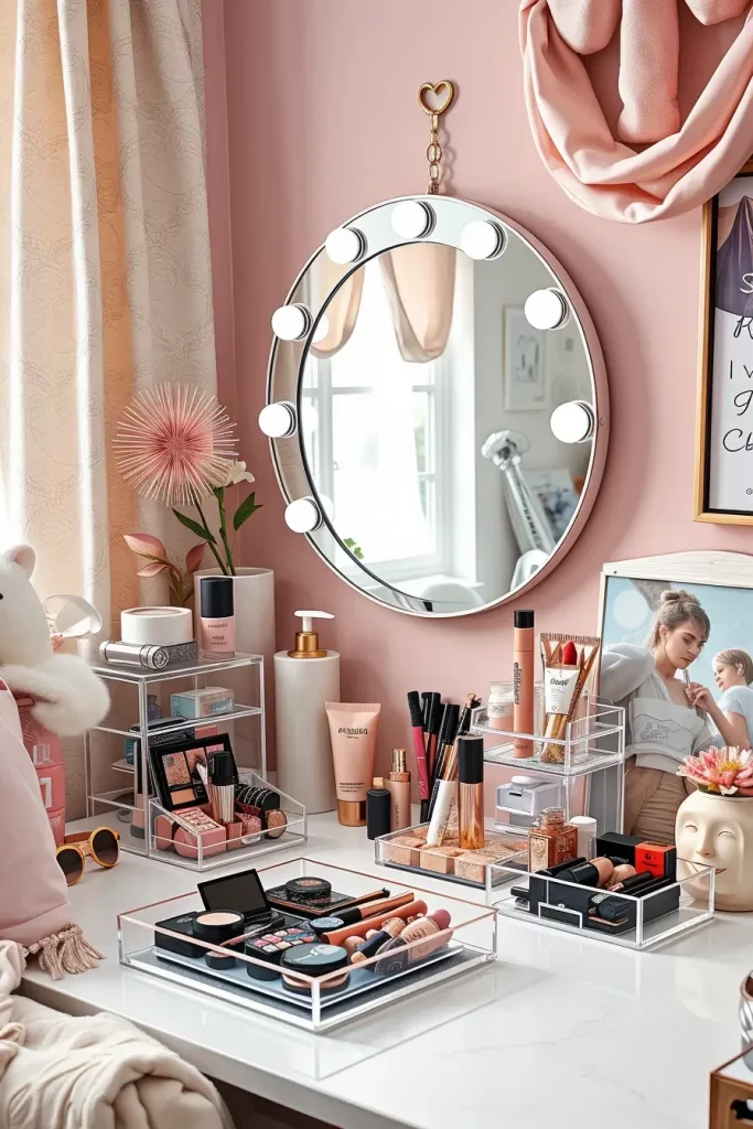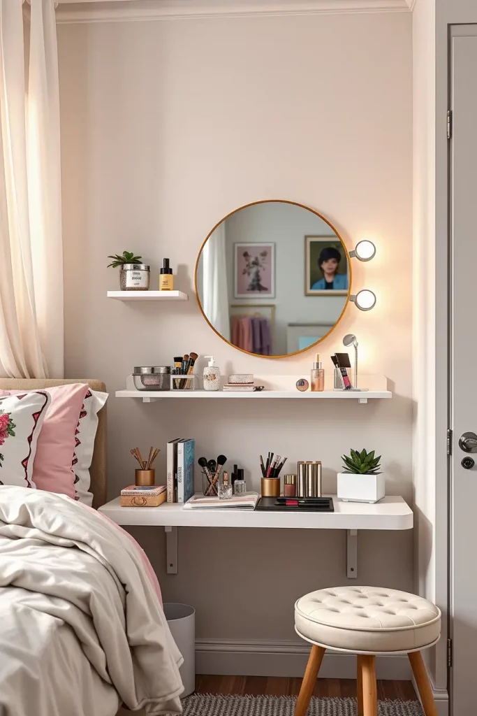 I took narrow floating shelf as a bottom and a small round mirror to sync with it. My cosmetics are organized in clear acrylic containers, mini drawer unit and tiered trays. I installed padded LED strip lighting around the mirror and a mini stool in which is there storage. A beauty tray with perfume and brush made it look like a shop.