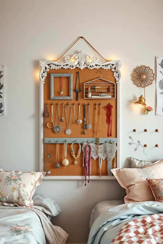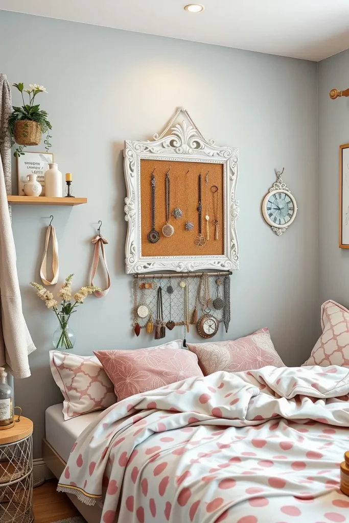 My top choices can be corkboards, recycled frames, or pegboards painted according to your color scheme. Use hooks, mesh, ribbons or tulle to store earrings and necklaces. Some time ago I used old frame as an earring holder, gluing lace on the reverse, and it is useful and so damn pretty. These items do not only hold jewelry but they also apply texture on your walls.