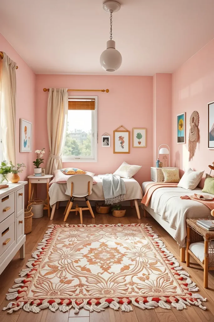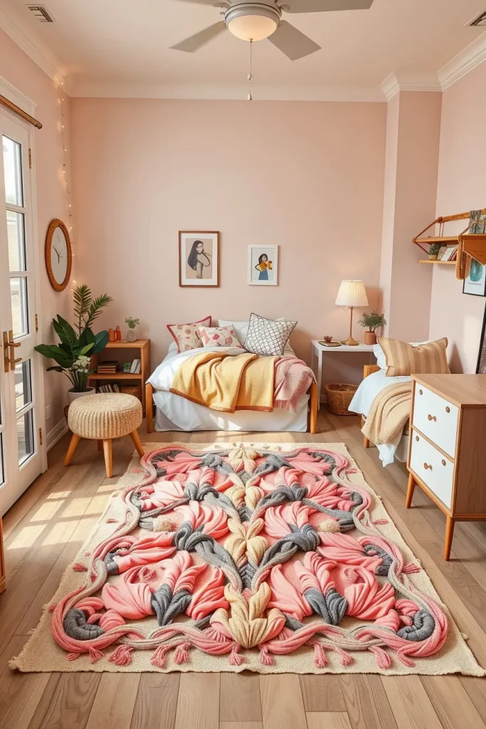 It is easy to make your own customized rug by braiding old t-shirts in a circle or square rug, or stenciling a design on an inexpensive, plain mat found in the dollar store. I once used spray paint and a stencil to mimic a boho tile rug—it completely transformed my room! This will bring some personal touch to it more so when you consider coloring it to the matching of beddings or even wall decals.