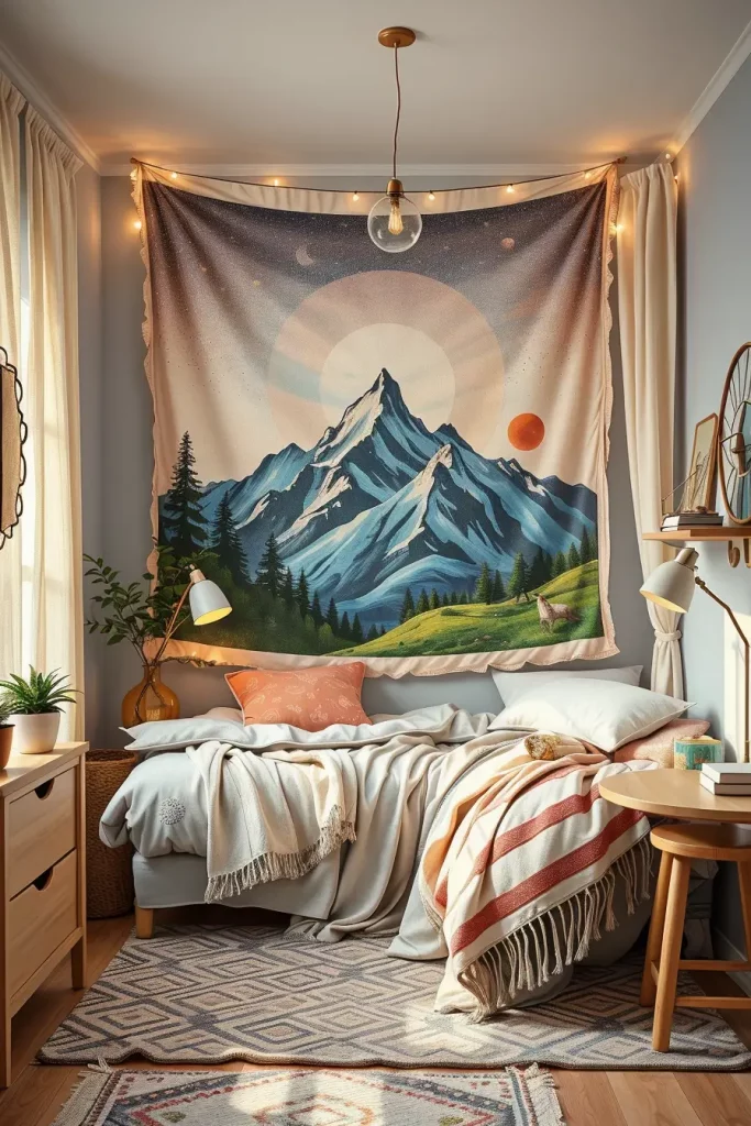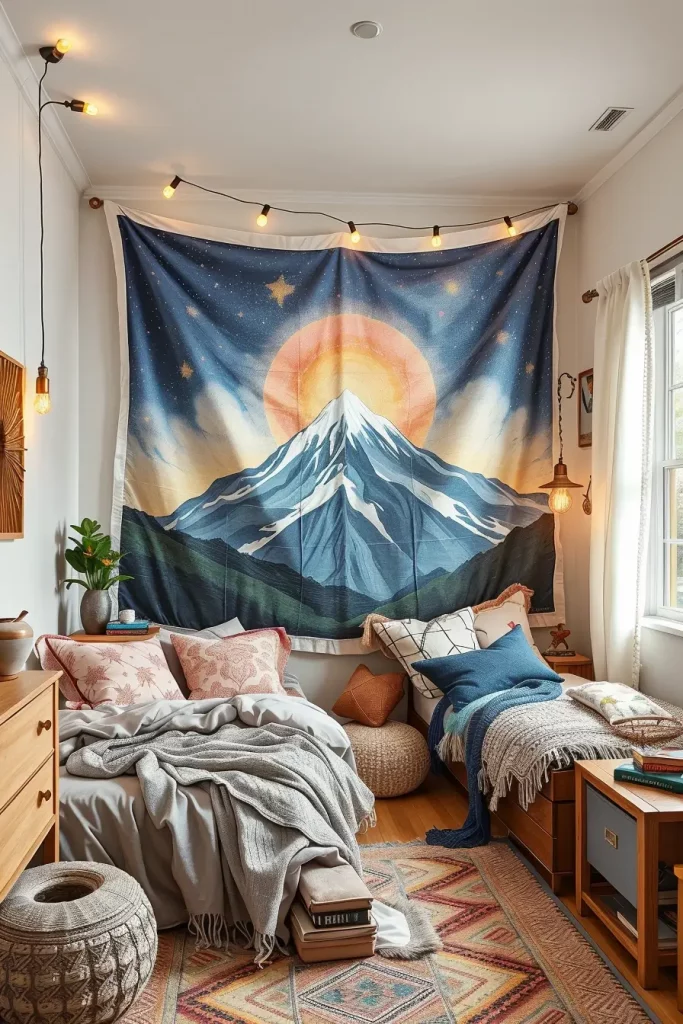 Don not forget about fairy lights or string lights above the tapestry. It is a minor thing, but it will make the entire area appear magical and relaxing.