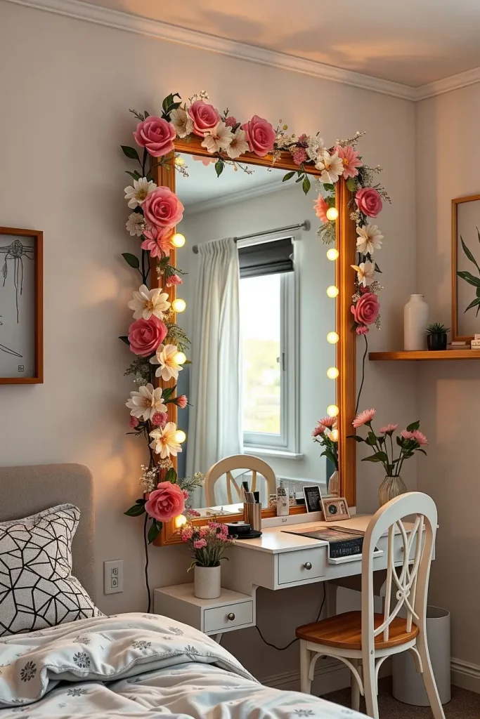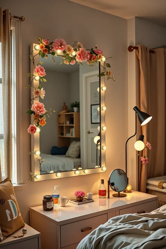 A mirror in a dorm is a must-have, regardless of whether it is needed to apply some makeup or check the outfit, yet typical ones are usually blasГ©. The upgrade of your mirror to DIY additions that do not spoil the look is strongly recommended to fit your dorm room ideas for girls DIY theme. It is ornamental and functional.