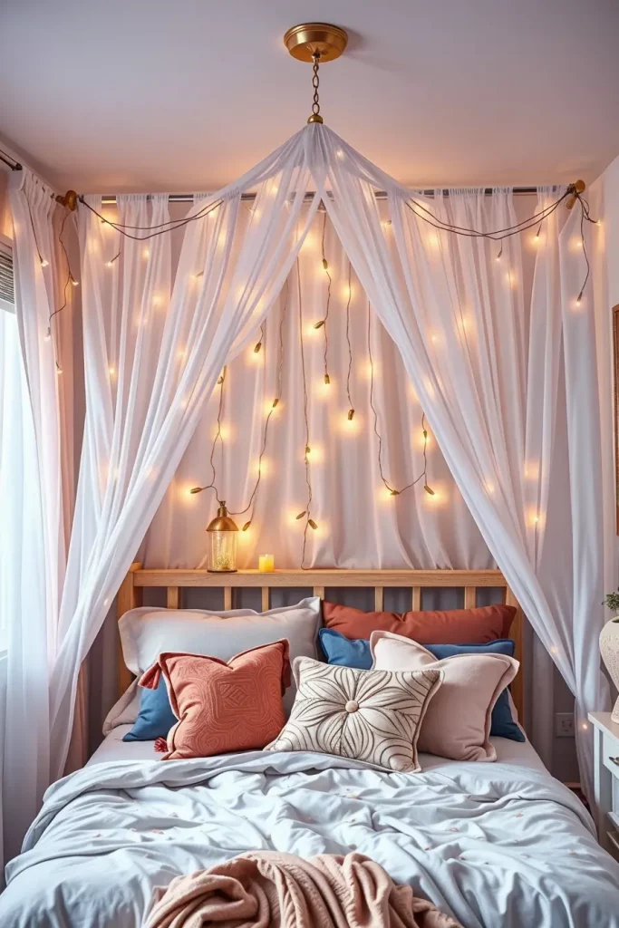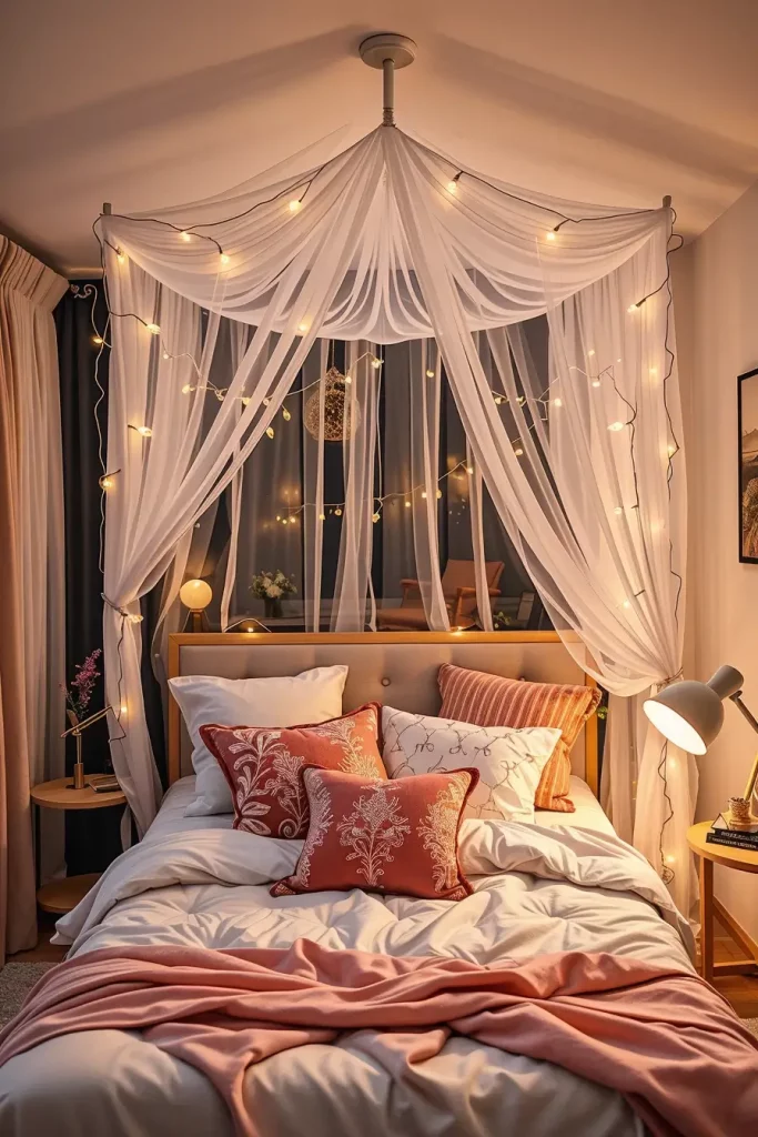 I tend to apply transparent white fabrics or light pastel skirts draping on the ceiling with some movable hooks. To add structure, I occasionally stretch wire between pairs of Command Hooks, or construct a rectangular frame with light weight PVC pipe. To make it look more charismatic, fairy lights or ribbons across the canopy borders provide an additional warm-up effect. Combine it with fluffy bedding, stacked throws and accent pillows in velvet to get the complete feel.