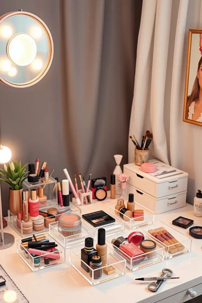 Put brushes into small acrylic drawers, mason jars, or unused jars. Insert a picture mirror, perhaps some peel on and remove LED lightkins and a tray on lipsticks or skincare. I once repurposed a utensil caddy into a makeup sorter—super handy and compact!