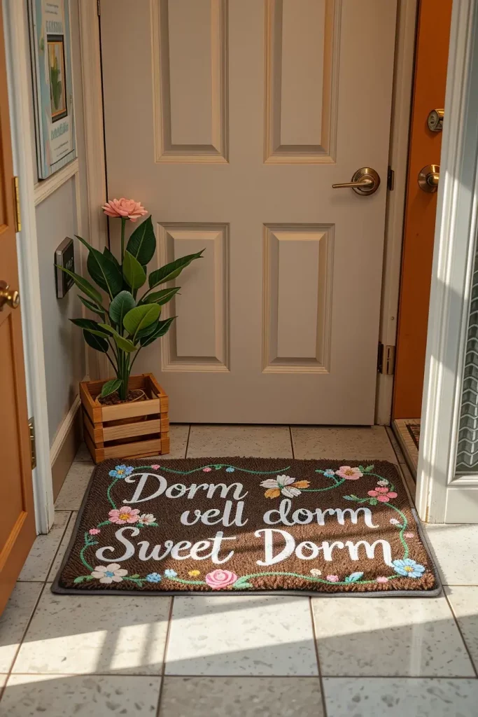 Depending on the rules in your dorm, you can put a small pot with a fake plant or a cute storage box directly next to it to achieve a full mini-entry effect. Never forget to seal it with clear spray in order to make your design remain that semester.