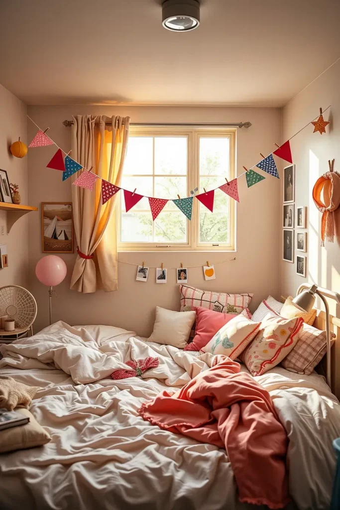 You can use twine or ribbon, scissors and themed materials. You may use the colored cardstock or fabric to make triangles, circles or even heart shapes. Decorate differently with a paint, glitter or messages. They can hang on windows, bedframes or study areas to cobble your theme. Whether you’re into boho, minimalist, or preppy styles, banner garlands work with any vibe.