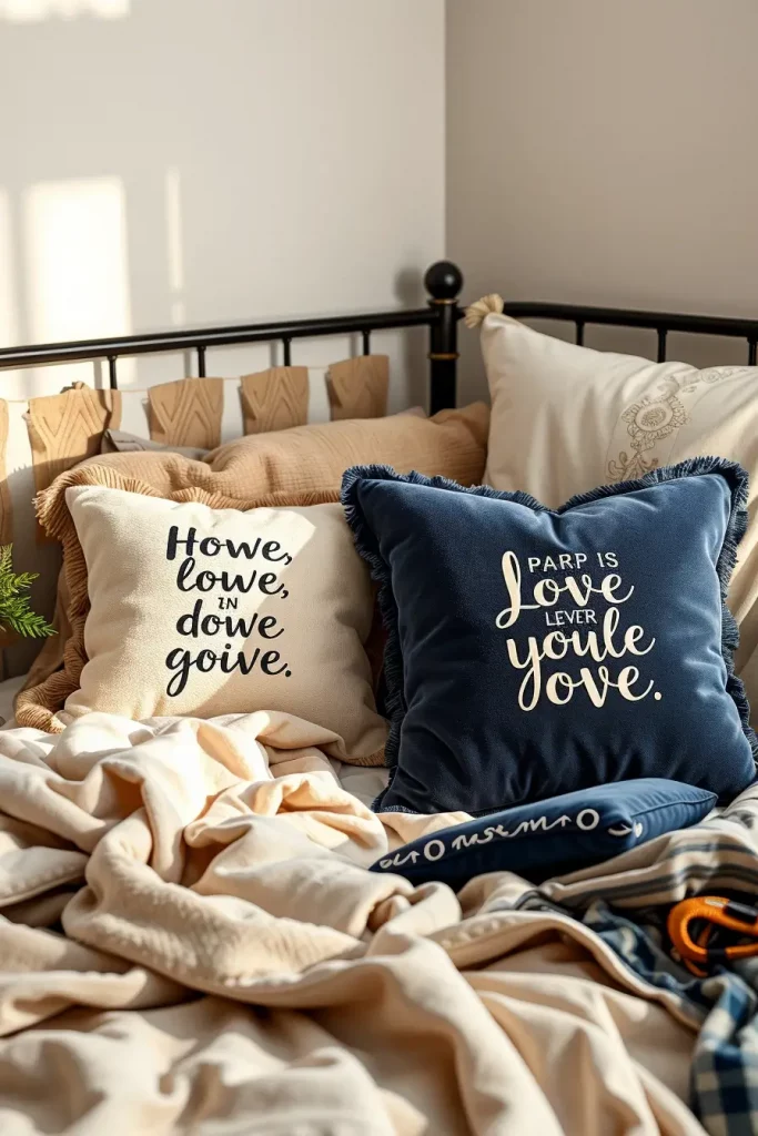 I prefer purchased pillow inserts that are pre-cut, or I cut up the old bed cushion. My preferred fabrics are fleece, velvet and cotton-linen mixes. I have even hand-stenciled a few on them with words of encouragement such as breathe or dream big in case I get bored of them. Sewing or adhesive clothing tapes are good to use on a rush task.