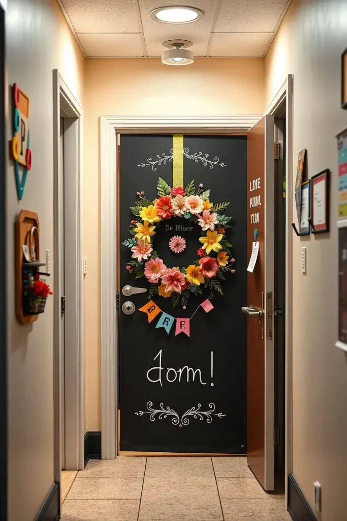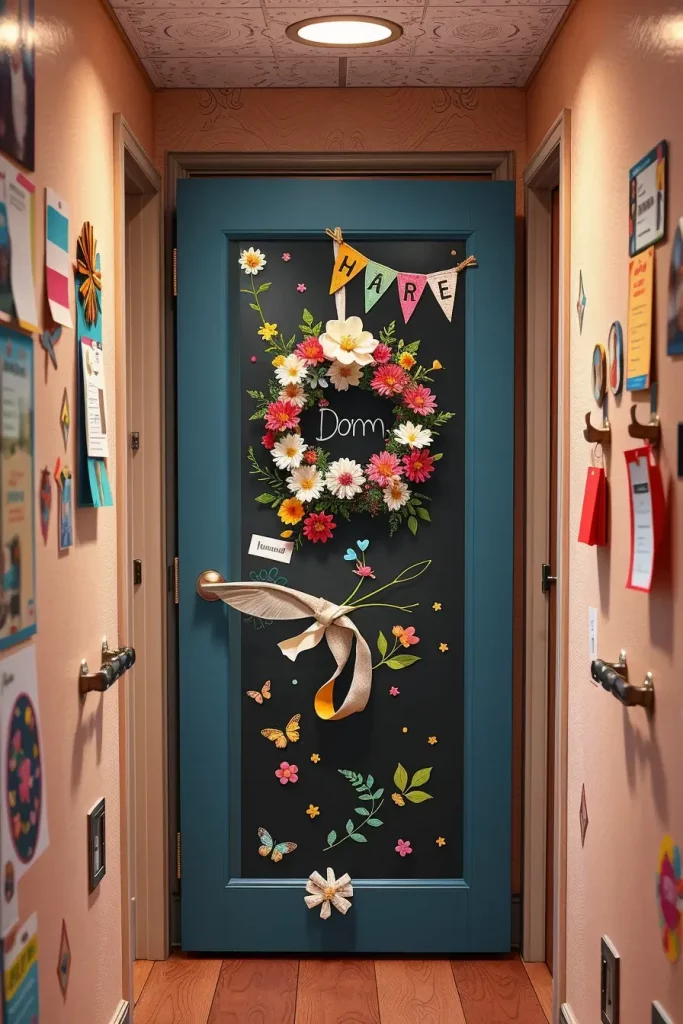 I normally use wreaths consisting of faux flowers or yarn, name tags (designed with handwriting), and seasonal banners to decorate my door. Another test has been chalkboard vinyl to doodle and write messages. I use anything removable such as mounting tape or Command hooks so I do not blot the surface. One can easily renew it every month or season and not to bore anyone.