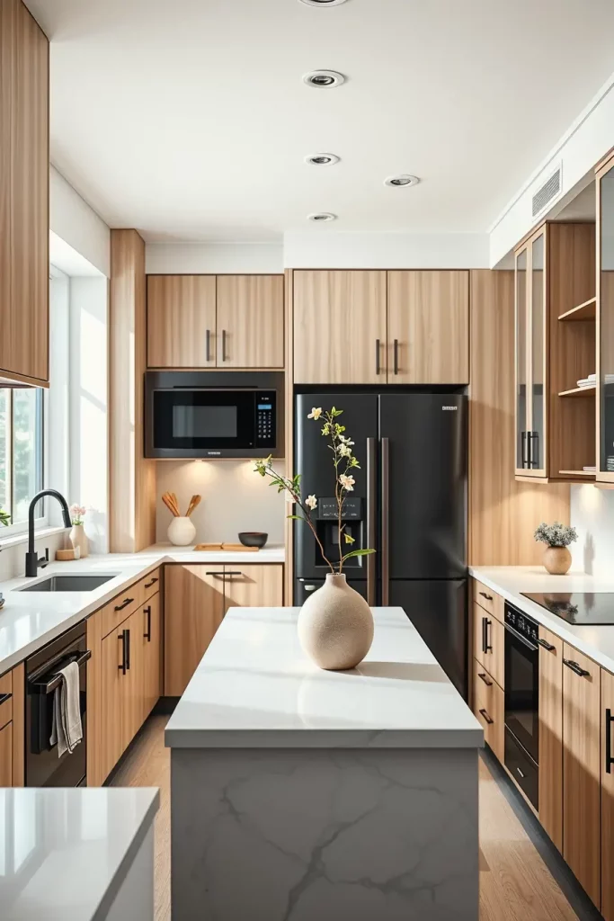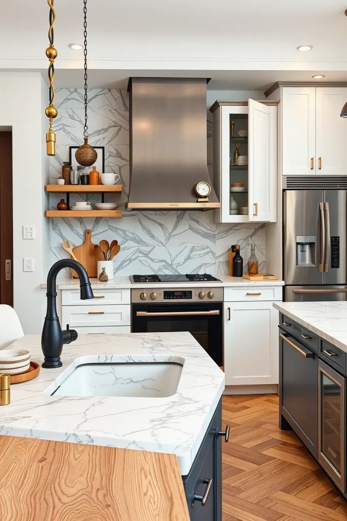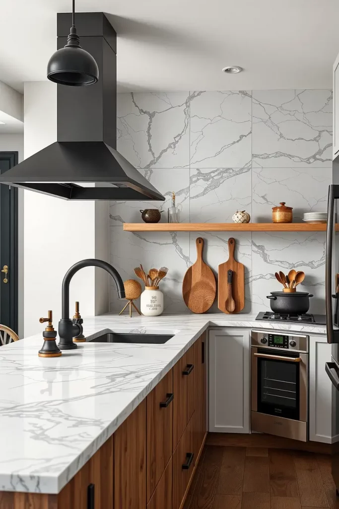 A flat kitchen needs textured elements for creating depth according to my recommendation. The visual composition of wood and marble and metal layers creates a modern and designed appearance. The technique works well in kitchens with minimal color palette yet require depth.
