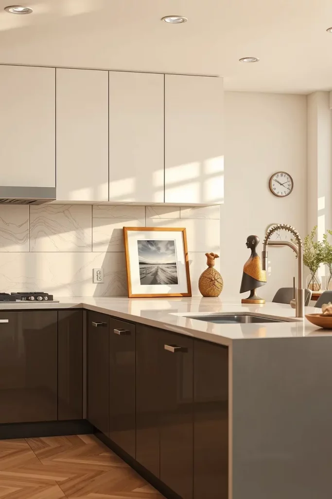 I select one or two basic appliances in matte black or brushed steel finishes to stop the design from becoming unbalanced. The low-profile fruit bowl and small tray with hand soap and lotion and minimalist vase with one stem create an elegant touch. The few select items bring both purpose and style to the counter while avoiding visual chaos. The kitchen cabinets should have a minimalist design with no handles and the backsplashes need to be glossy and smooth.