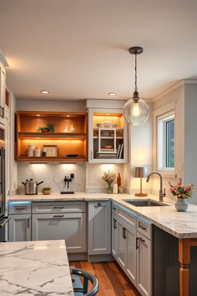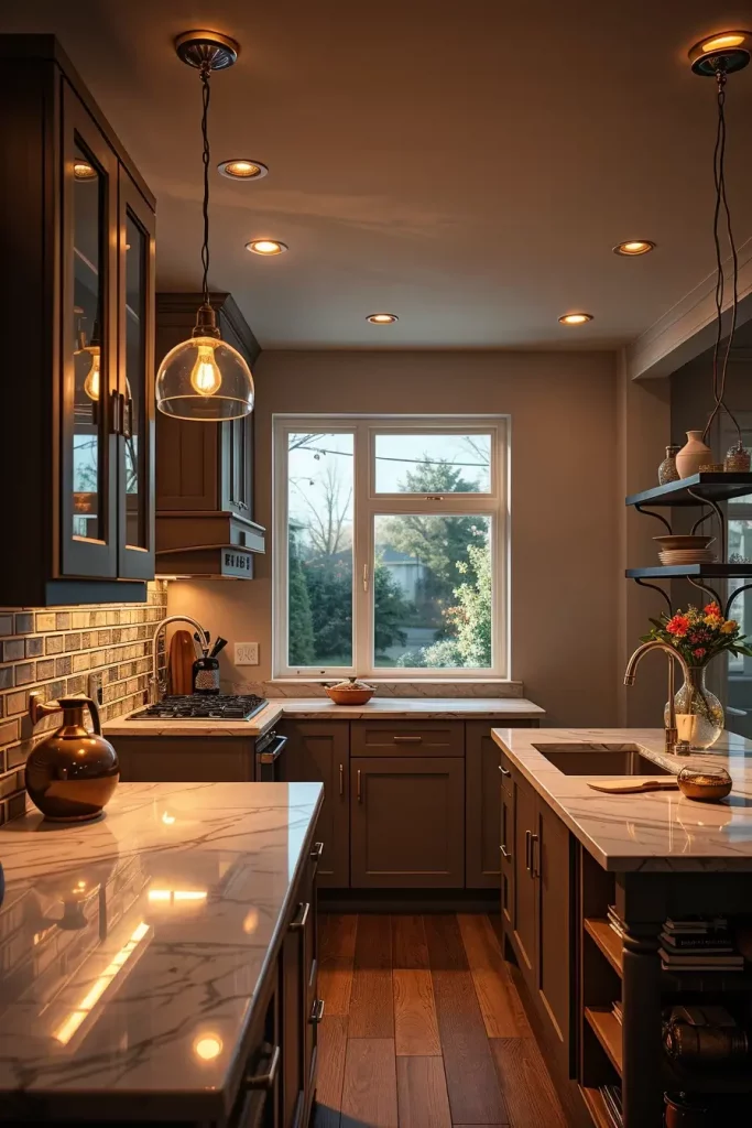 I choose under-cabinet LED strips because they provide both functional task lighting and atmospheric illumination. A small accent lamp on the counter should be added for open layouts. Islands and counter areas become focal points when equipped with pendant lights that also enhance the appearance of stone and glass elements by using warm bulbs.