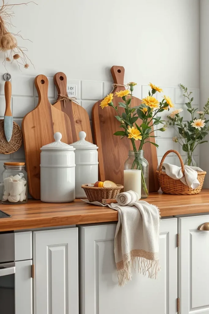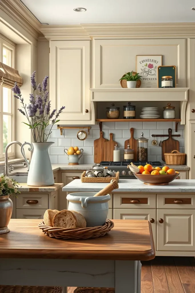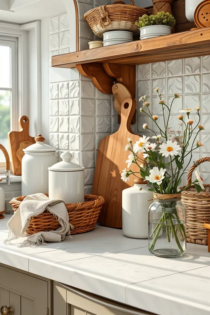 I regularly use antique cutting boards with cream-colored canisters and glass containers that display flour oats or dried ingredients. The setup includes a linen towel resting casually on the counter edge together with a woven bread basket and fresh flowers. The aesthetic works best when combined with white subway tiles together with brass fixtures and wood countertops.