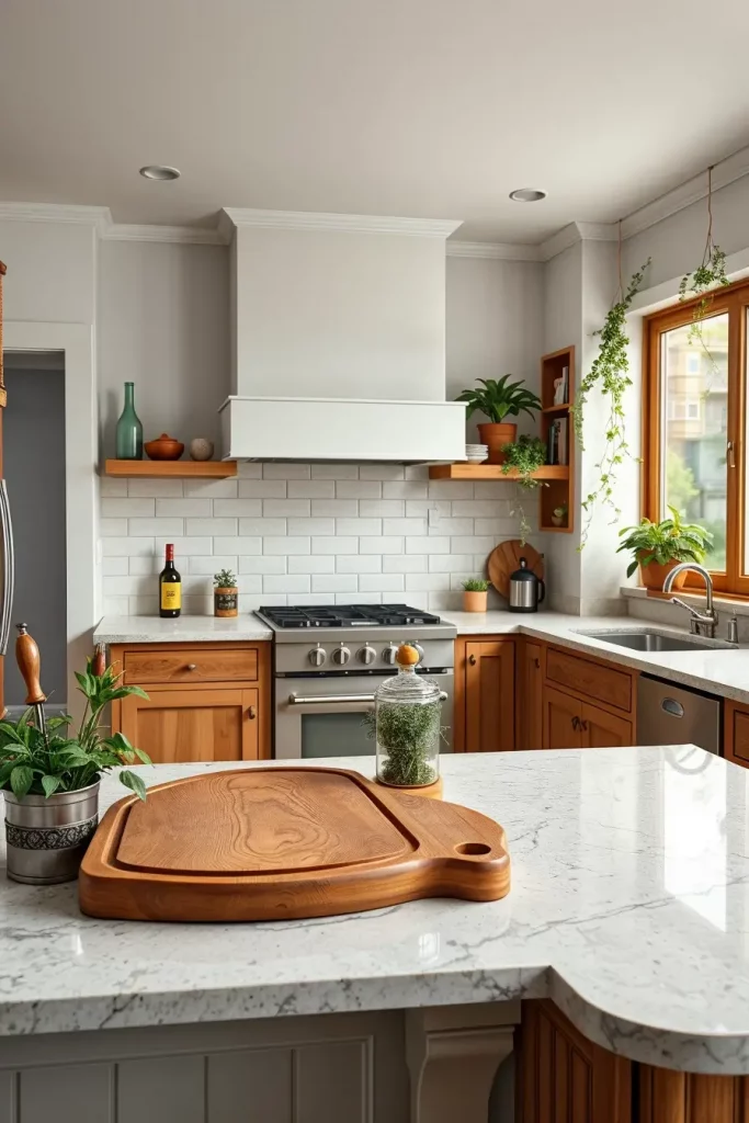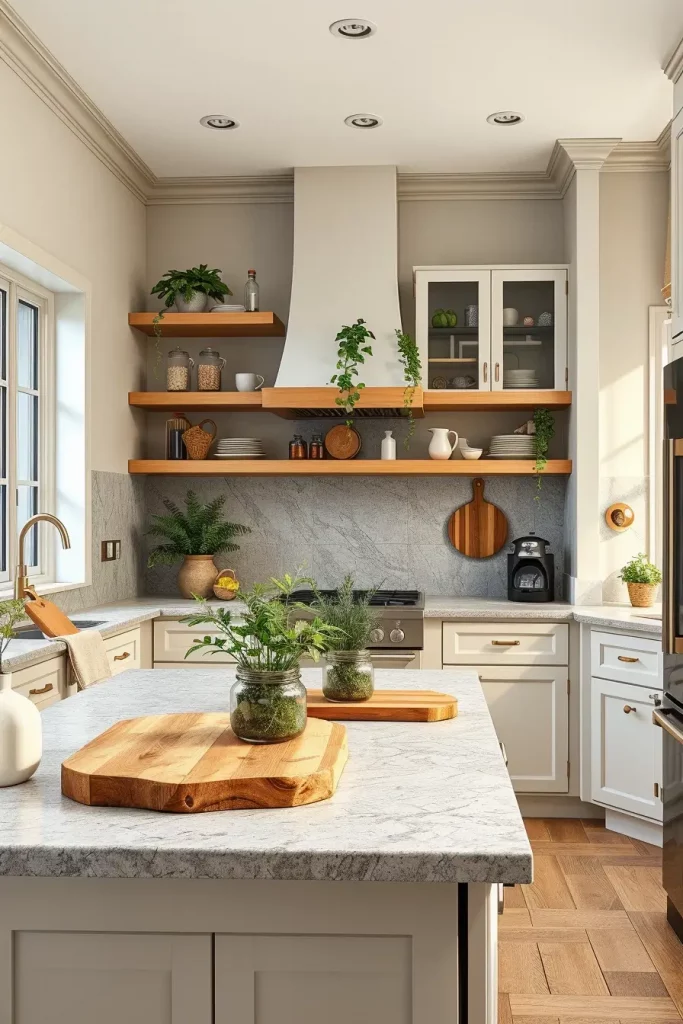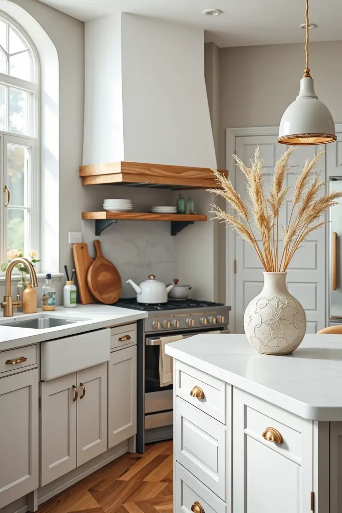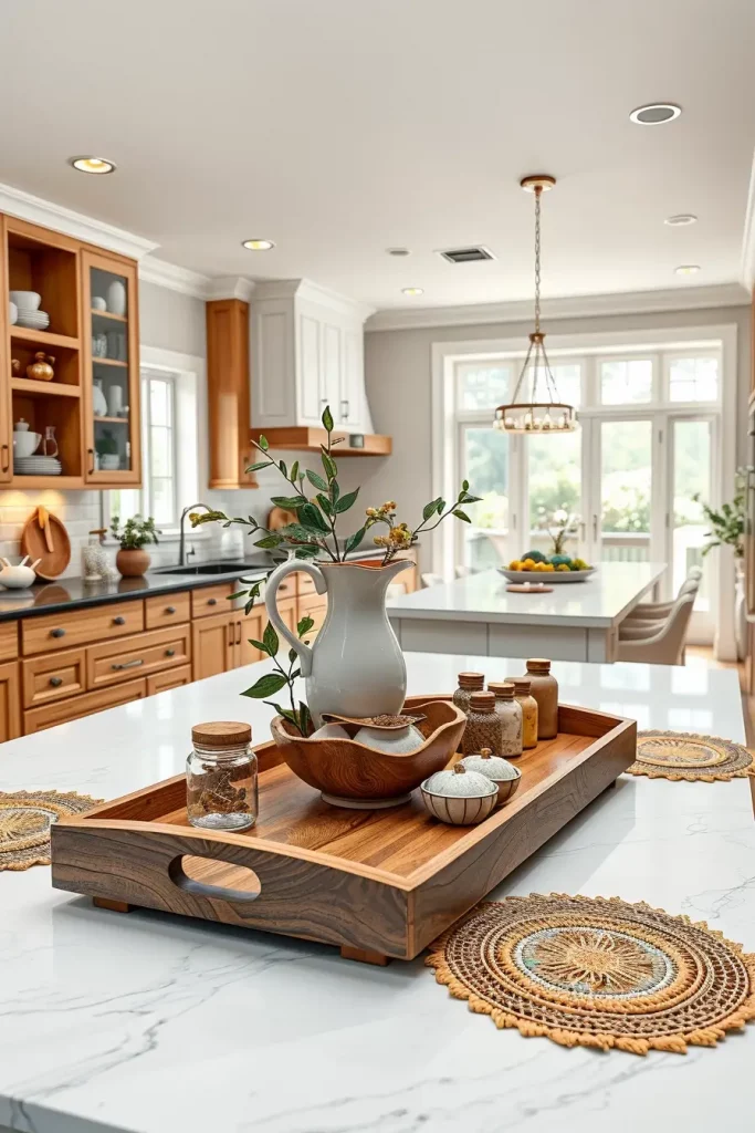 I have always found joy in using natural materials to style my kitchen counters. Wooden decorations along with small plants inside pots bring warmth and vitality to the kitchen space. The incorporation of greenery and grain becomes crucial for spaces with cold or sterile environments because they help round off harsh corners. Nature-based materials ease the sense of stone and tile elements.
