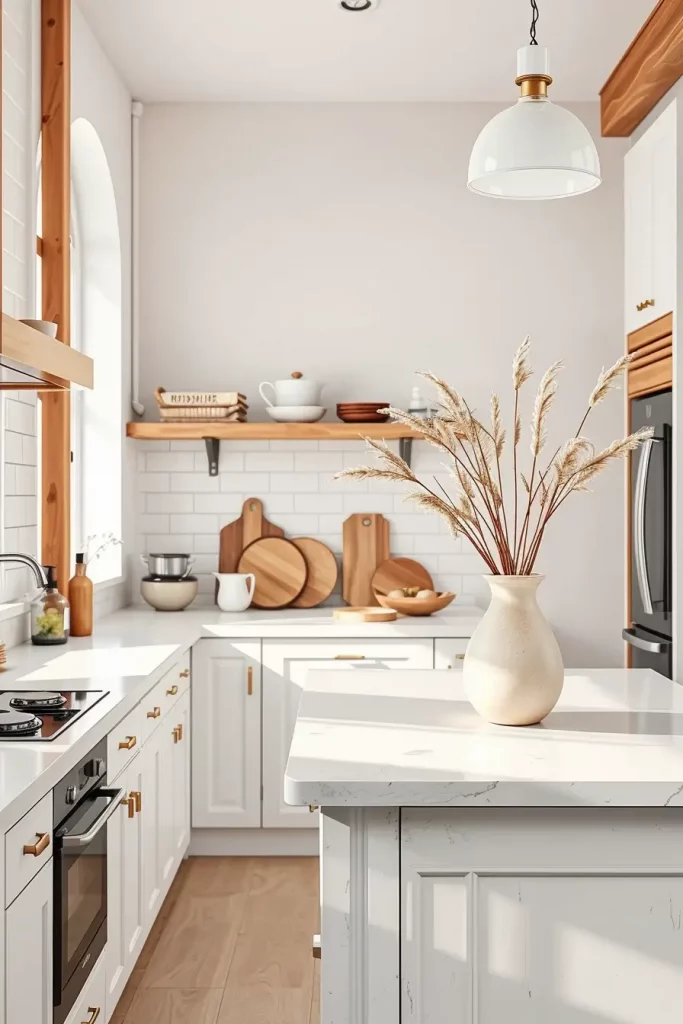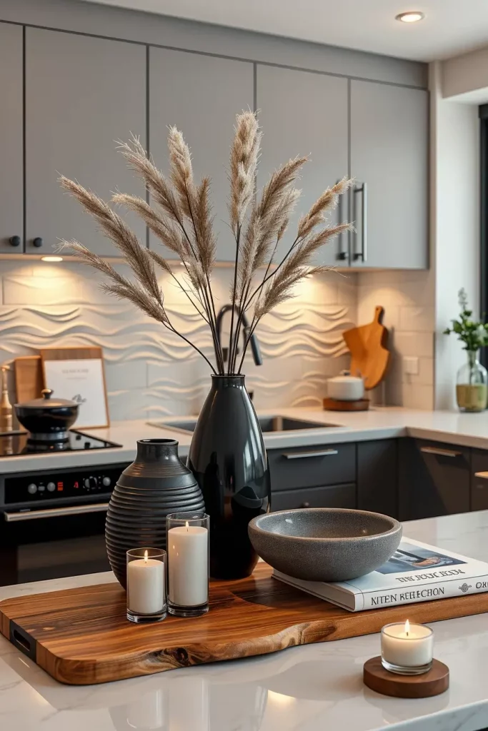 I begin design projects by selecting either white or light wood countertops alongside soft decor items with neutral colors. The combination of a dried grass ceramic vase with a minimal wood tray holding oil and vinegar bottles alongside a stone bowl containing eggs or fruit creates an appealing decorative ensemble. The look benefits from open shelving combined with integrated lighting.