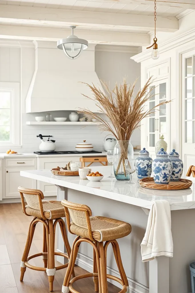 I place beach grass or dried palm leaves inside a large glass vase on the counter while displaying blue and white ceramic jars next to it. The backsplash area gains both style and practicality from wooden cutting boards that lean against it. The tray setup includes seashell decorations with fresh lemons and a soft linen towel to finish the coastal design. A framed artwork depicting an ocean horizon in muted colors helps unite all elements.