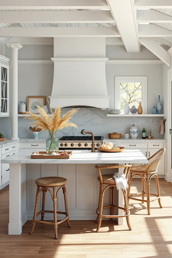 A coastal-style kitchen needs to create an atmosphere where occupants experience relaxation together with airy feelings which stem from nature’s inspiration. My recommendation for kitchen counter design always includes pale color schemes that combine white and sandy beiges and cool aquas. Organic materials such as wood and stone and woven textiles should be included in the design of kitchen counters when following this style. The white marble countertop becomes more relaxed when driftwood-toned stools and rattan trays are added. The design requires open spaces that natural light together with minimal window treatments create successfully.