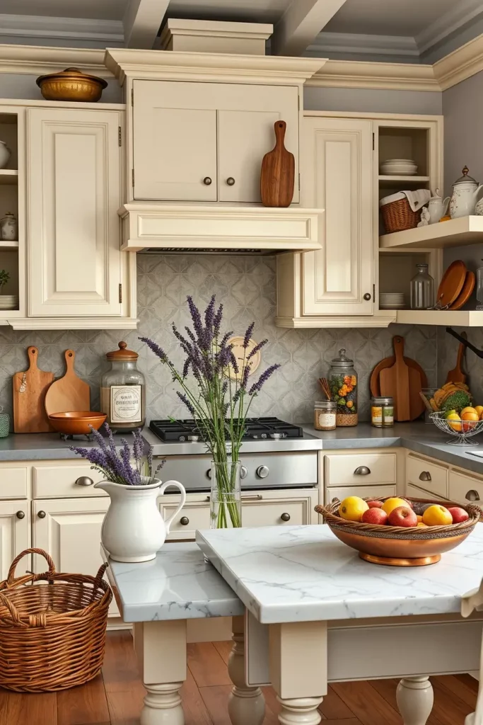 I begin the counter vignette with a white or cream enamel pitcher containing lavender stems. The next items I add are vintage breadboards followed by a marble mortar and pestle and a small group of apothecary-style spice jars. A rustic fruit bowl made from aged copper or ceramic contains figs and apples to create visual appeal. The counters gain visual appeal through the placement of wicker baskets.