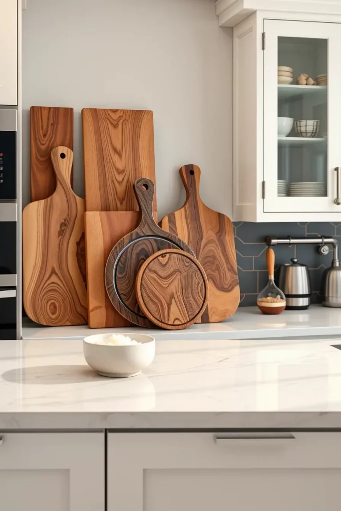 Cutting boards function as decorative elements when arranged with purpose in mind. I prefer to work with wood boards in varied dimensions and colors which include acacia and walnut together with oak. By placing them vertically along the backsplash they create a welcoming textured charm. The strategy provides useful functionality together with attractive visual elements that function in multiple kitchen settings.