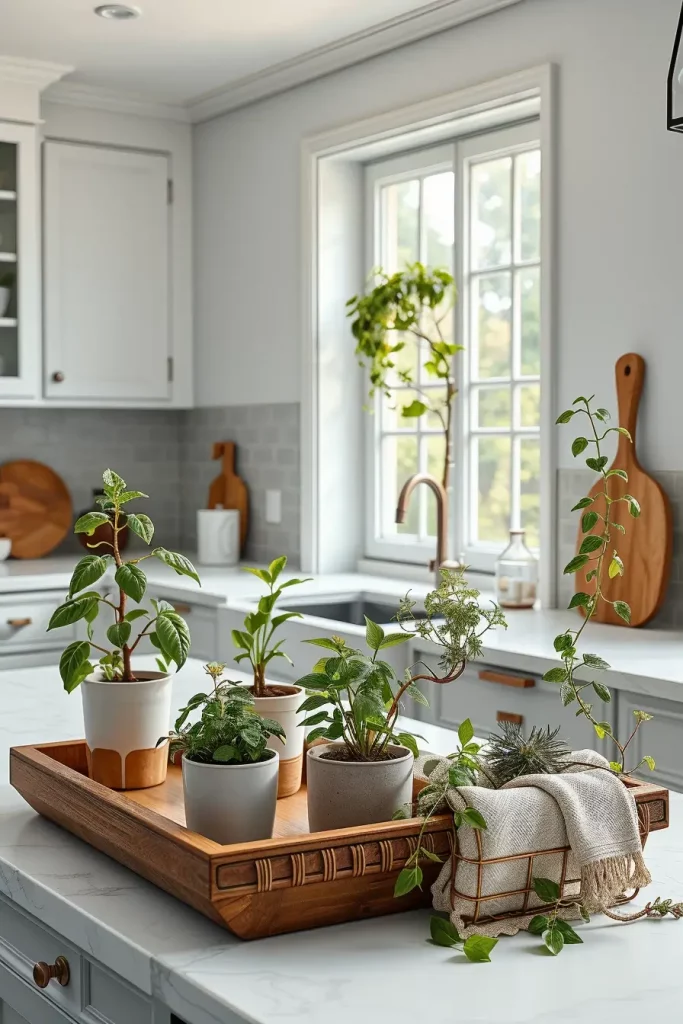 I display three to four small pots either on a wooden tray made from reclaimed materials or inside a wire basket with rectangular shape. Trailing plants such as pothos can be combined with other plants in ceramic planters. The vibrant green color stands out brilliantly when it meets neutral countertops made from quartz or soapstone. A glass misting bottle together with a folded linen towel placed nearby communicates thoughtful attention.