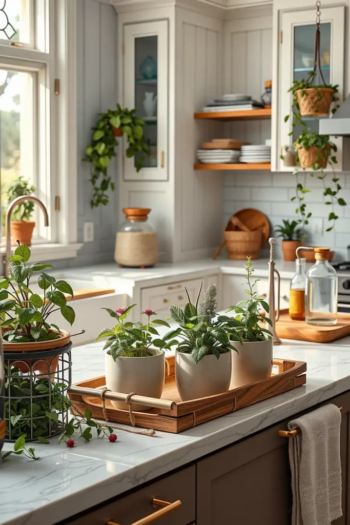 Your kitchen receives liveliness and colorful charm through the addition of greenery. Live herbs including basil and thyme and mint should be placed in terra-cotta or ceramic pots near the kitchen counter. These decorative items serve practical functions during everyday cooking activities. Group your plant containers together and use containers which complement your kitchen design.