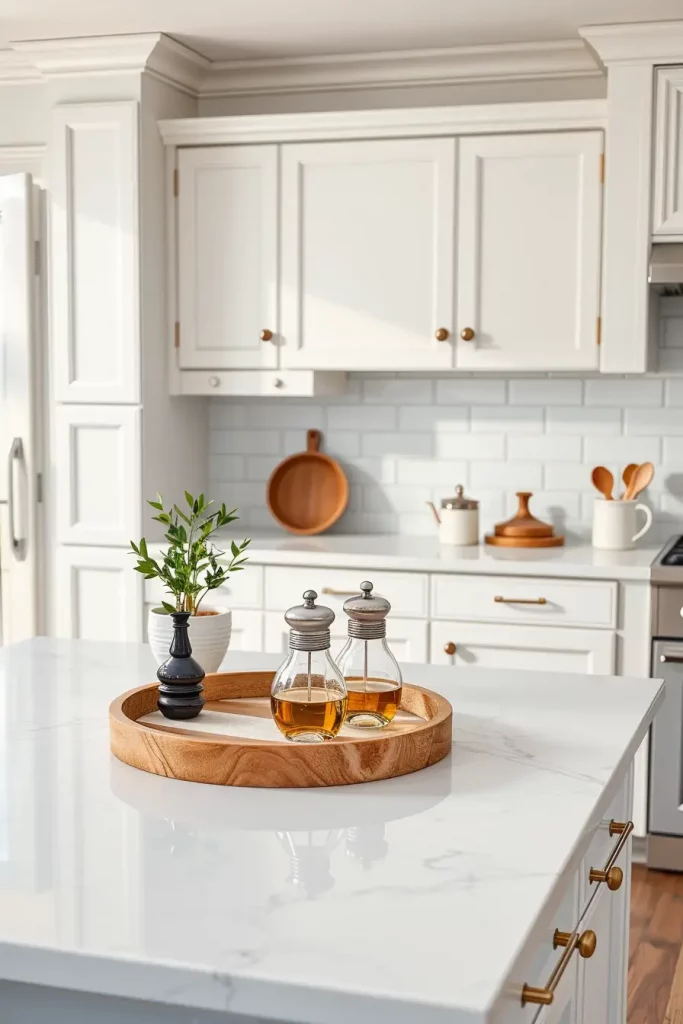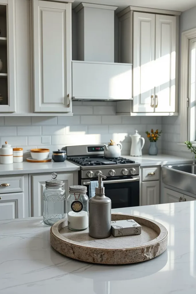 I choose marble wood and metal trays according to the kitchen’s color scheme. A round wooden tray warms up white kitchen spaces whereas a black metal tray creates visual contrast in lighter settings. I place olive oil bottles together with salt and pepper grinders and a small plant beside a jar of wooden spoons onto the tray. The arrangement of daily-use items on the tray should create an aesthetically pleasing display that also provides convenience.