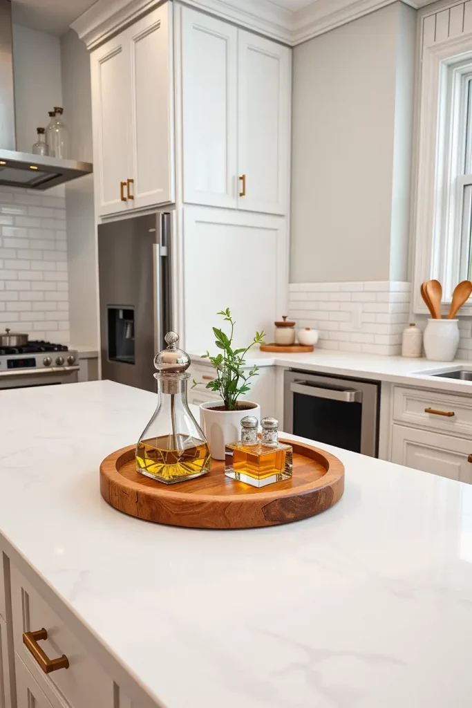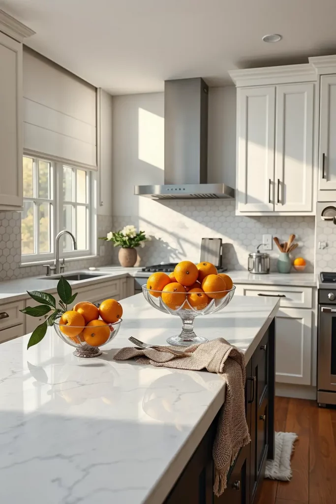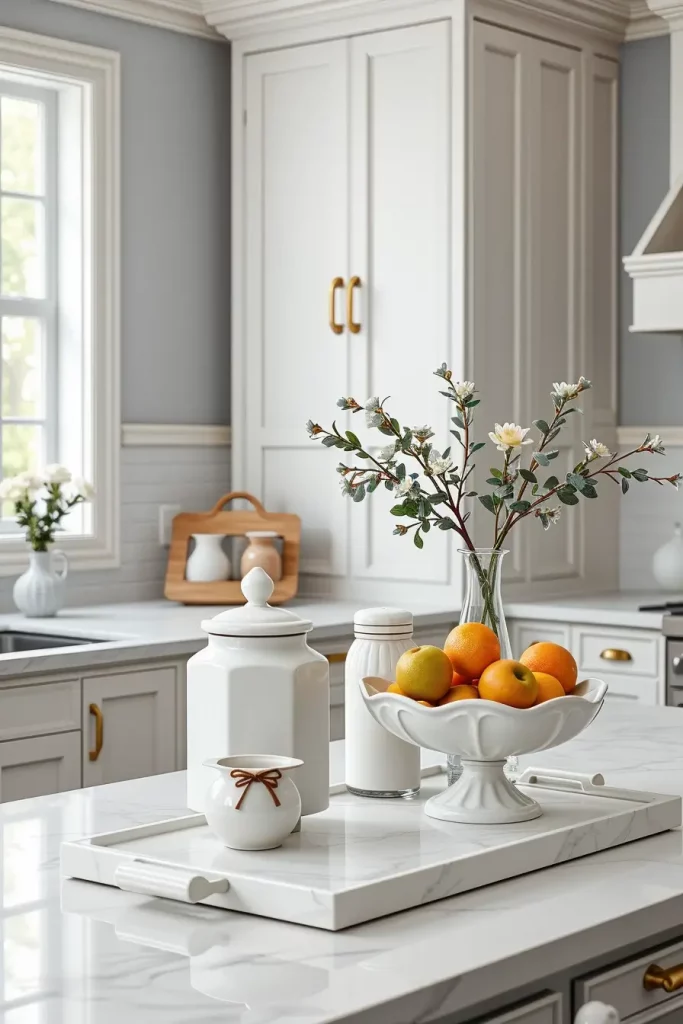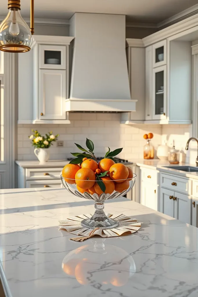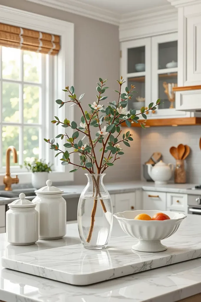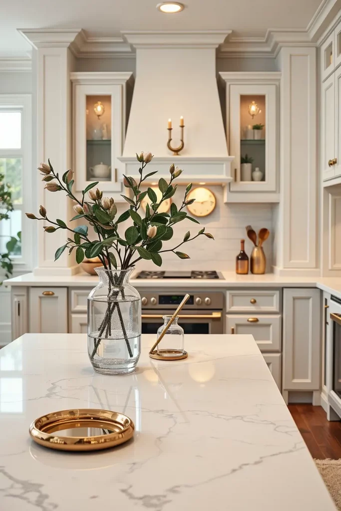 When using white marble countertops I arrange off-white ceramic canisters alongside a low glass fruit bowl and pale green eucalyptus stems in a crystal vase. The glossy appearance of quartz works best with small accessories made from polished chrome or brushed brass such as trays and utensil holders. The luxurious atmosphere is enhanced through these details which never overpower the natural beauty of the material.