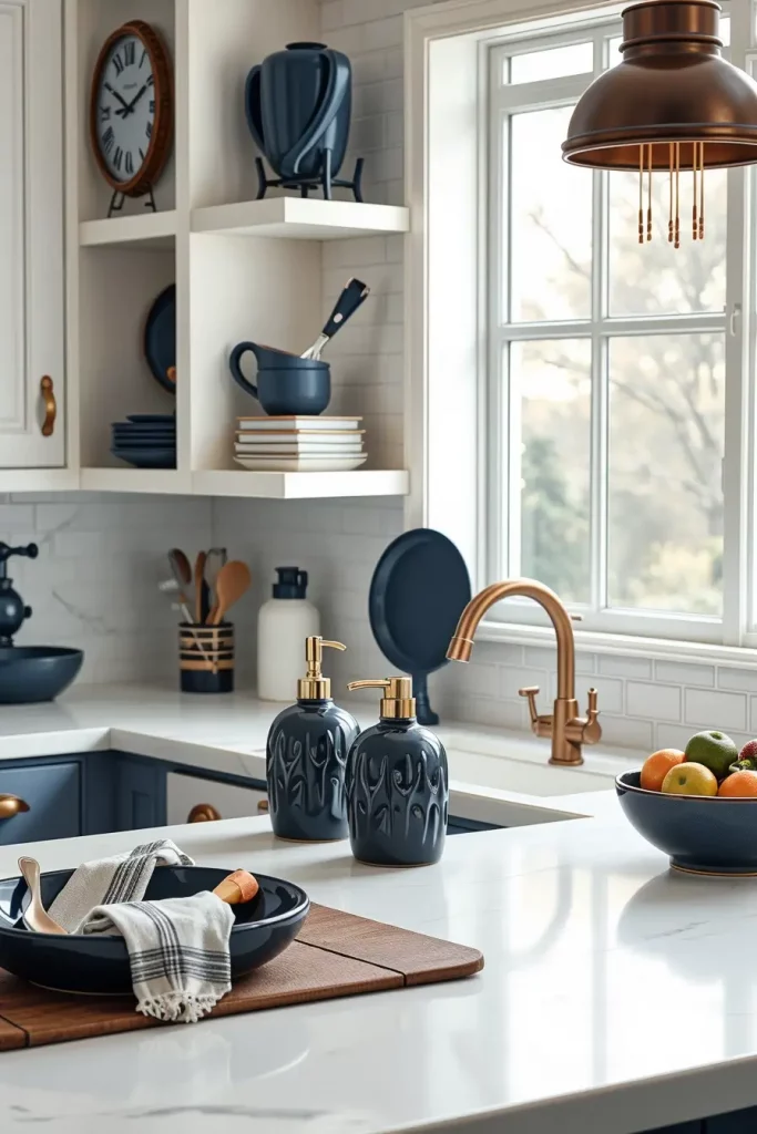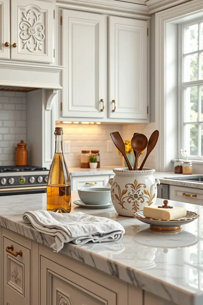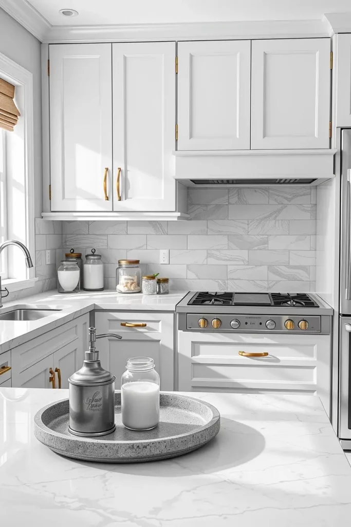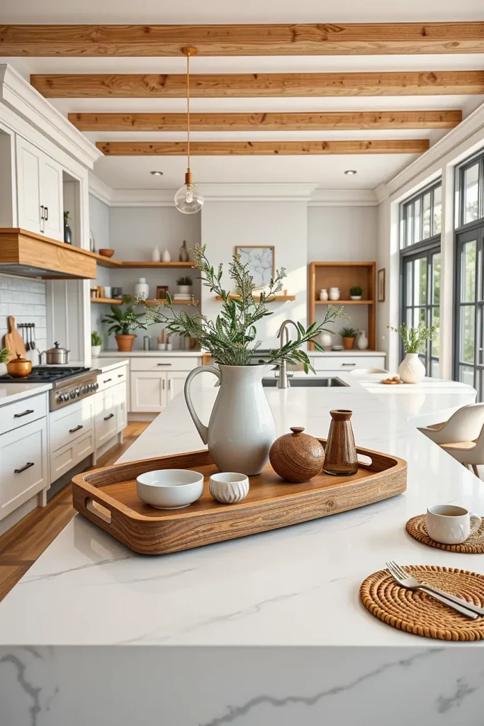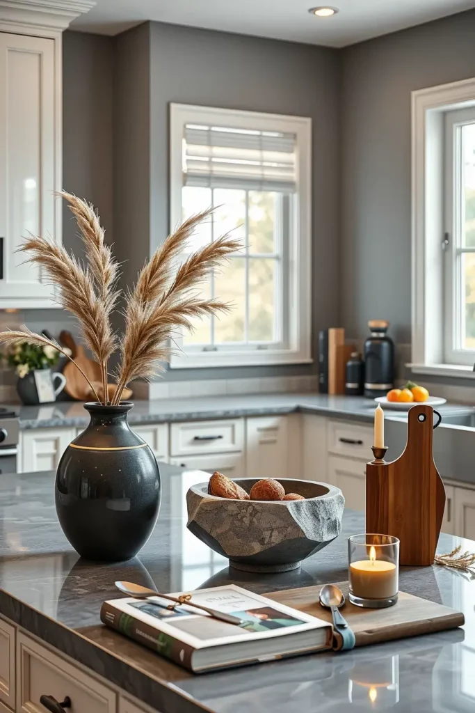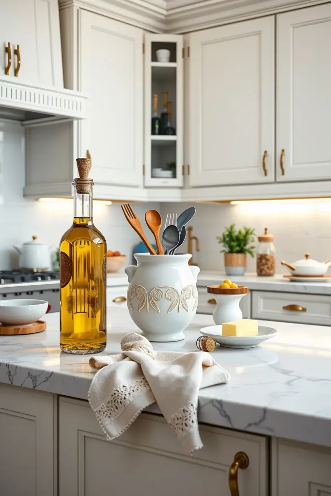 When using white marble countertops I arrange off-white ceramic canisters alongside a low glass fruit bowl and pale green eucalyptus stems in a crystal vase. The glossy appearance of quartz works best with small accessories made from polished chrome or brushed brass such as trays and utensil holders. The luxurious atmosphere is enhanced through these details which never overpower the natural beauty of the material.