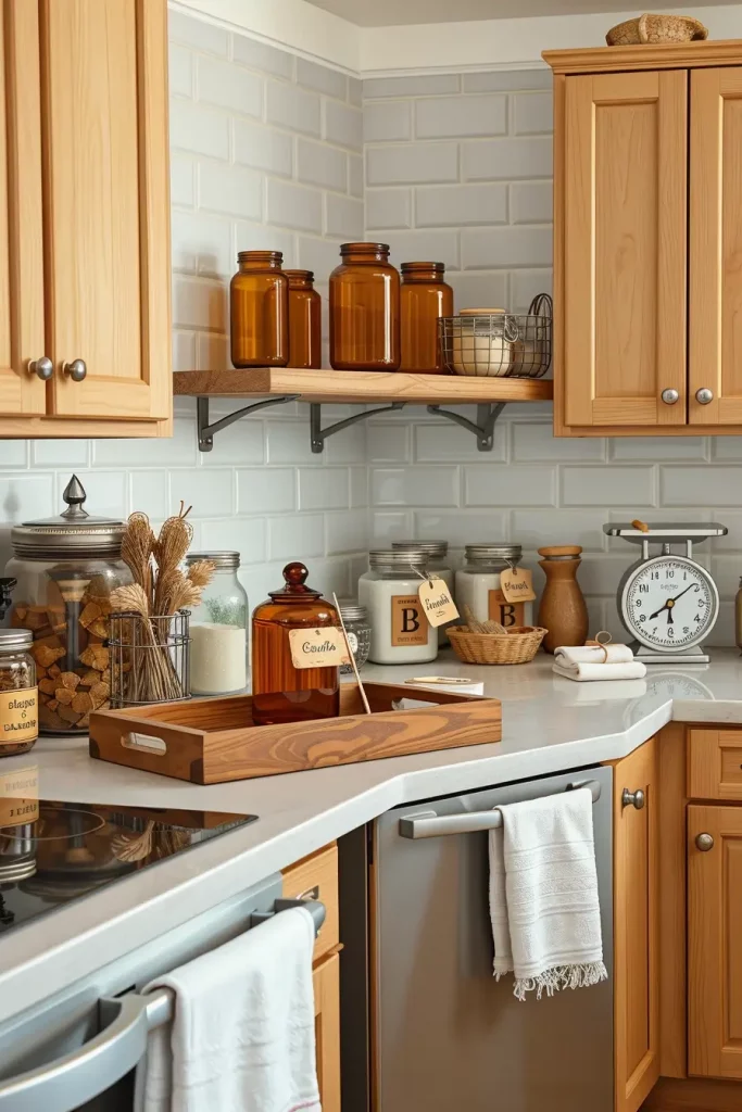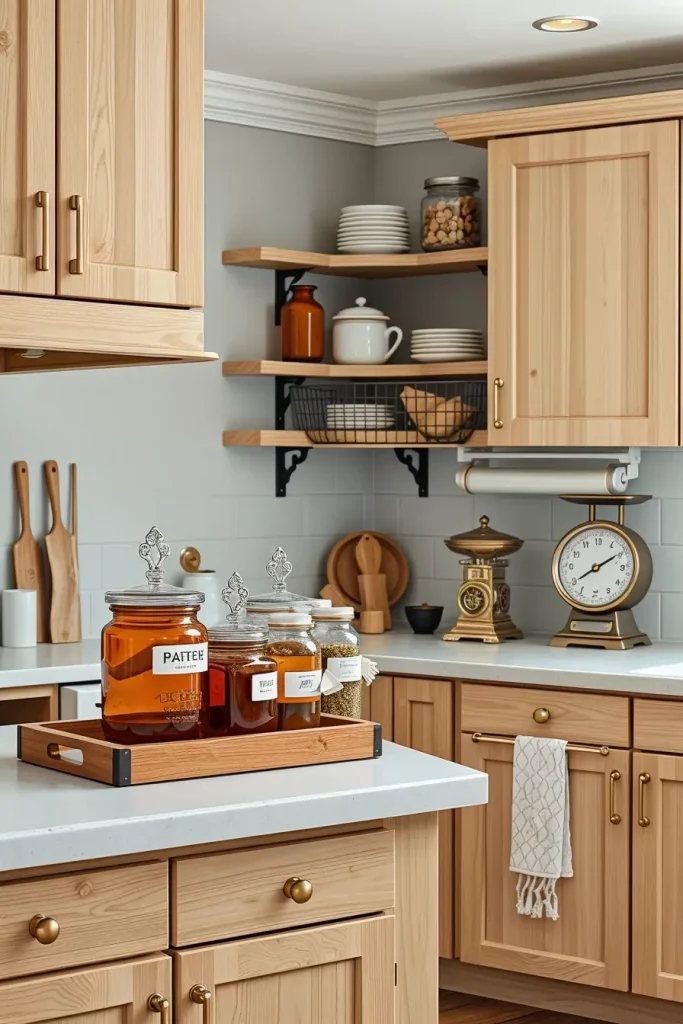 The section would be completed with a vintage kitchen scale and a tray of spices presented in matching mini jars. These elements function as both attractive decorations and practical tools that match the concept of stylish storage.