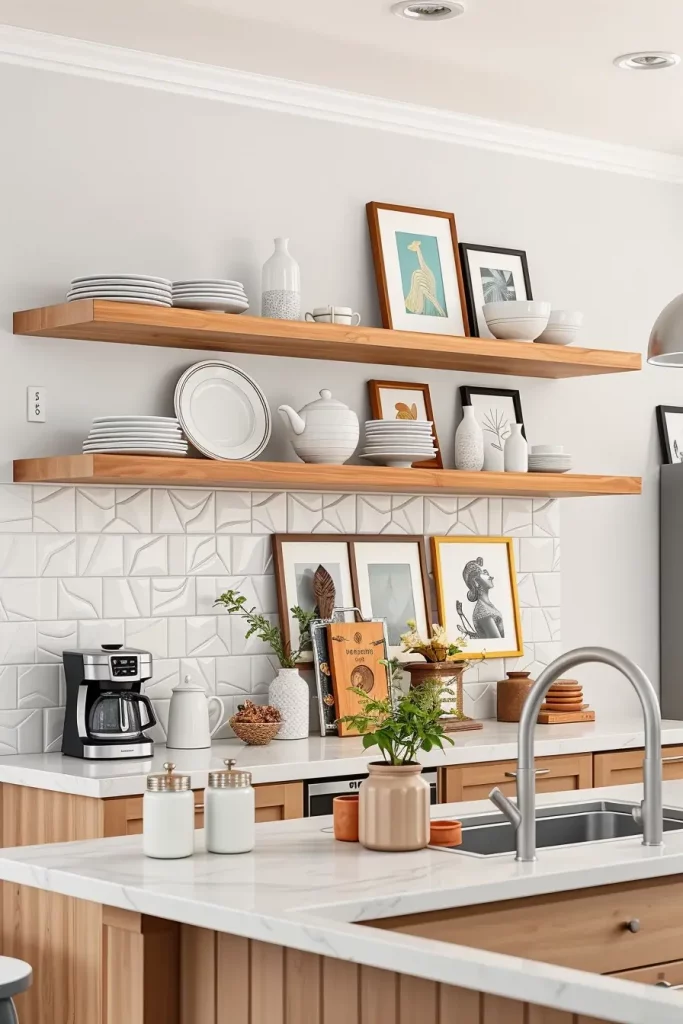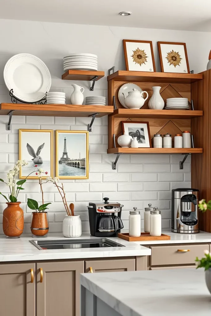 I arrange two wooden or metal shelves above a counter section before placing decorative elements including stacked white plates and clear drinking glasses and a couple of art prints in slim frames. The shelves pair well with small decorative items including mini vases or jars. The counter space below receives matching ceramics together with a carefully designed coffee station featuring an elegant grinder and matching mugs that originated from the upper shelf.
